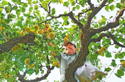 9月2日,永城市双桥镇碱荒村村民在采摘酥梨。该村拥有700亩生态梨园,村民靠种植梨树实现增收致富。孙海峰摄