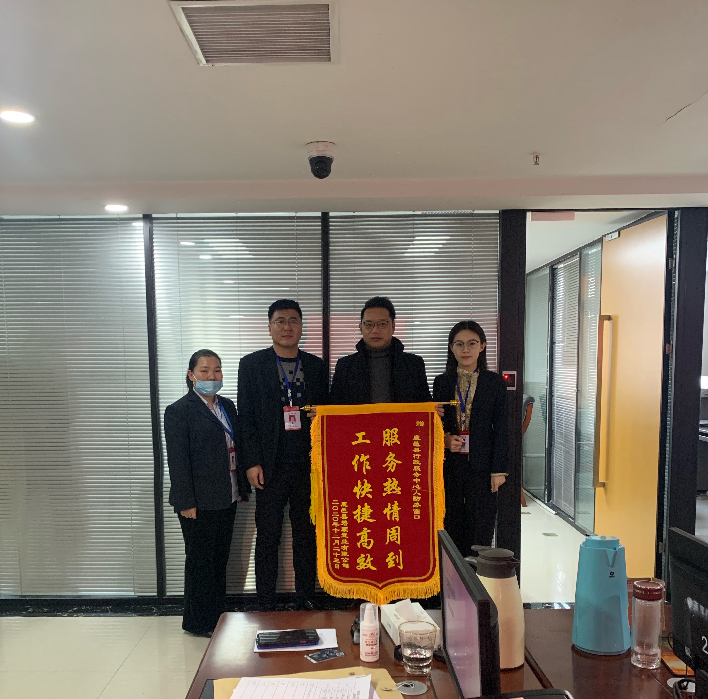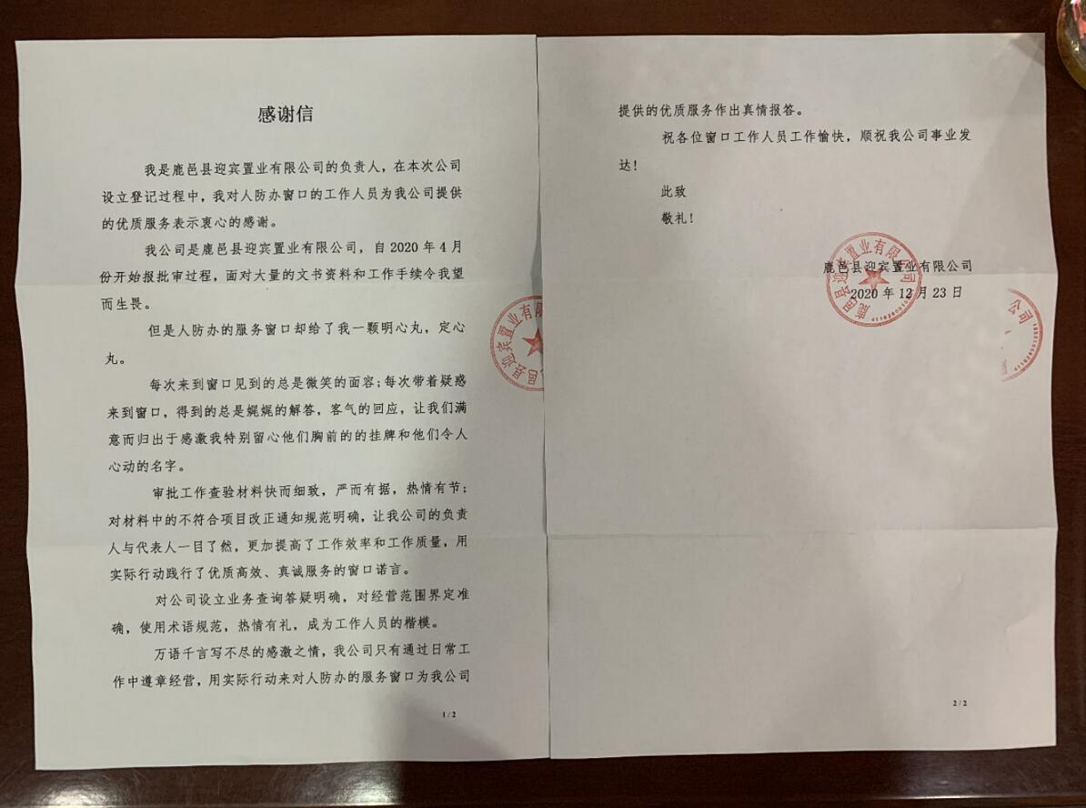 12月23日,鹿邑碧桂园置业有限公司工作人员将一面写有“服务热情周到,工作便捷高效”的锦旗送到了行政服务中心人防窗口,当天同时收到迎宾置业有限公司送来的感谢信。企业纷纷对工作人员在办理相关人防手续时提供的服务表示高度认可和衷心感谢。