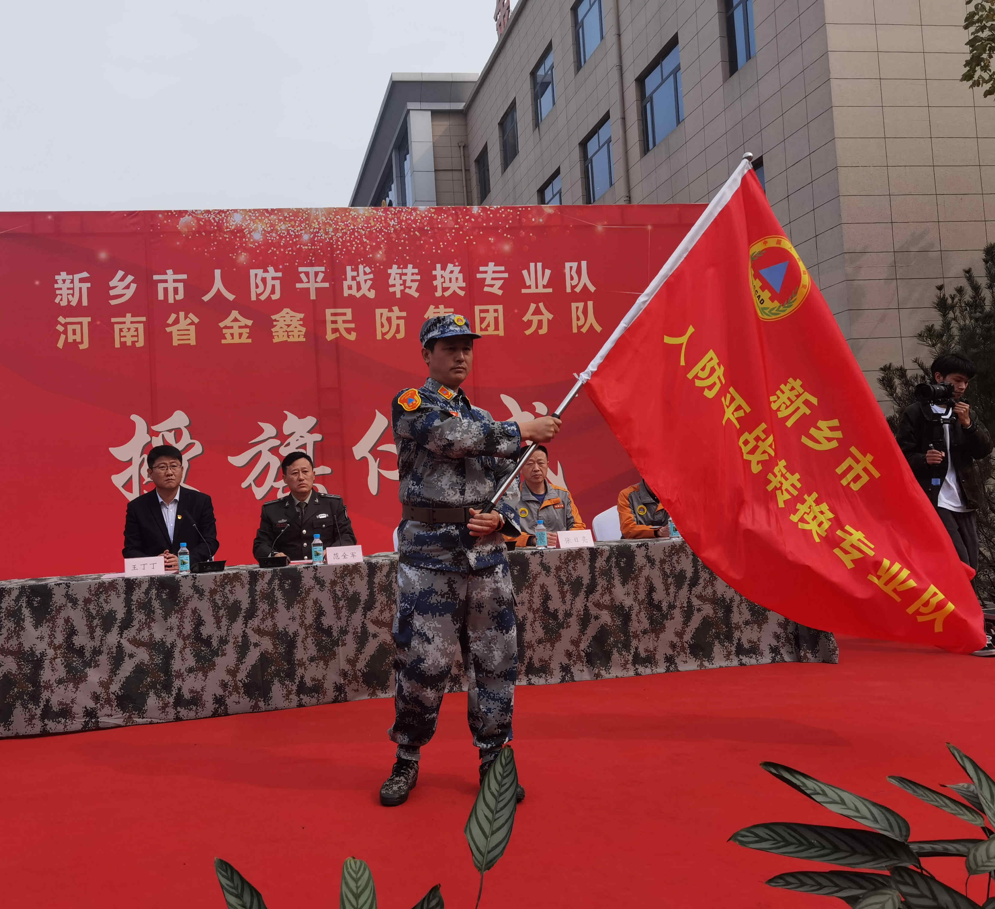10月29日,新乡市人防办、平原示范区管委会,在河南省金鑫民防(集团)有限公司厂区举行新乡市人防平战转专业队授旗仪式。新乡市人防办主任郭亮、党组成员、副主任张日亮,平原示范管委会副主任韩斌、示范区城乡建设管理局(人防办)局长王丁丁,河南省金鑫民防(集团)有限公司董事长范全军、总经理范全涛等领导出席授旗仪式。