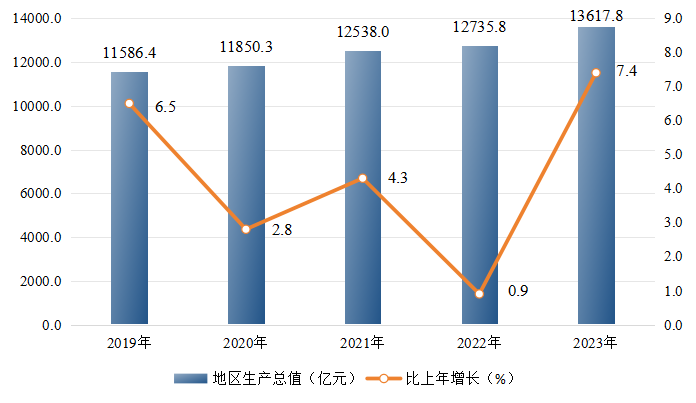 图1:2019-2023年郑州市地区生产总值及其增长速度