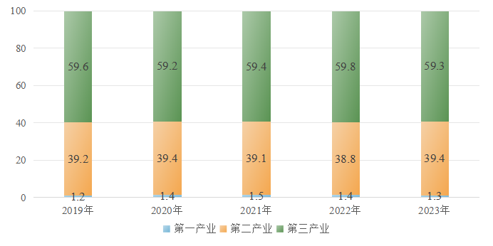 图2:2019-2023年郑州市三次产业增加值占地区生产总值比(%)