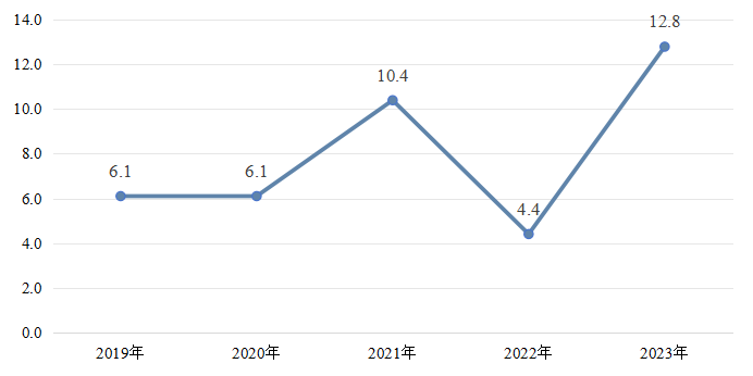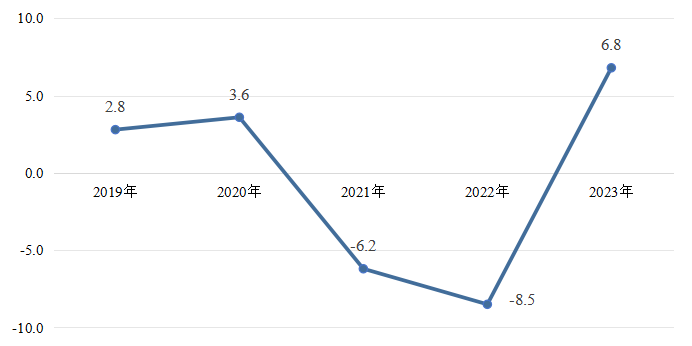 主要工业产品产量有升有降。其中,移动通信手持机(手机)14289.2万台,比上年下降7.5%;汽车55.5万辆,增长33.1%;新能源汽车6万辆,下降13.4%;铝材699.6万吨,增长3.4%;钢材115.3万吨,下降2.7%;速冻食品76万吨,下降27.7%;耐火材料制品438.5万吨,下降9.2%;服装0.2亿件,增长2.0%;水泥1230.6万吨,下降3.1%;卷烟797.1亿支,增长0.6%;电力电缆77.9万千米,增长33.3%。图52019-2023年郑州市规上工业增加值增速(%)