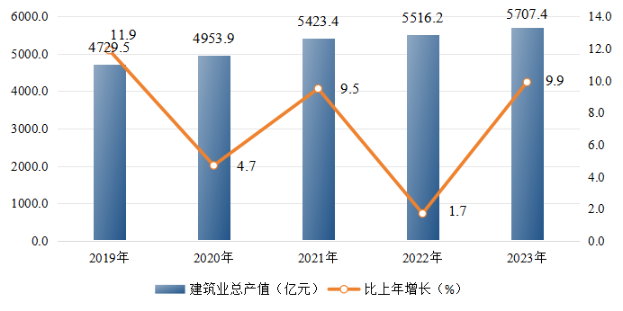 图6:2019-2023年郑州市建筑业总产值及其增长速度
