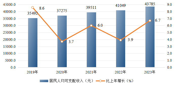 全年居民人均可支配收入43785元,比上年增长6.7%。其中,城镇居民人均可支配收入48740元,增长5.3%;农村居民人均可支配收入30383元,增长7.6%。全年居民人均生活消费支出29501元,比上年增长11.4%。其中,城镇居民人均生活消费支出31843元,增长10.0%;农村居民人均生活消费支出23168元,增长13.1%。