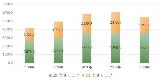 全年货物进出口总值5522.3亿元,比上年下降9.0%。其中,进口1953.2亿元,比上年下降21.0%;出口3569.1亿元,比上年下降0.8%。