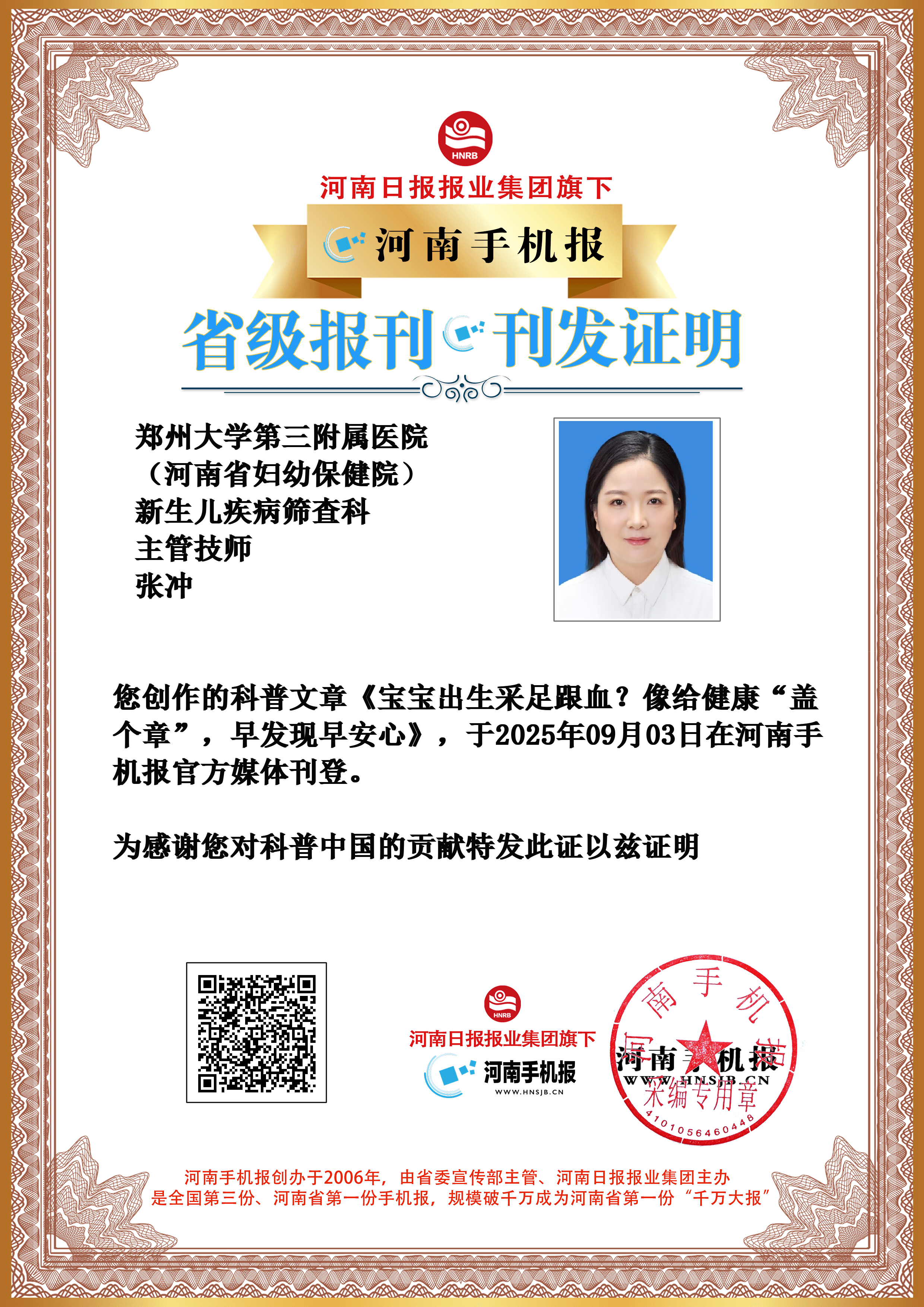 (张冲 郑州大学第三附属医院(河南省妇幼保健院) 新生儿疾病筛查科 主管技师)