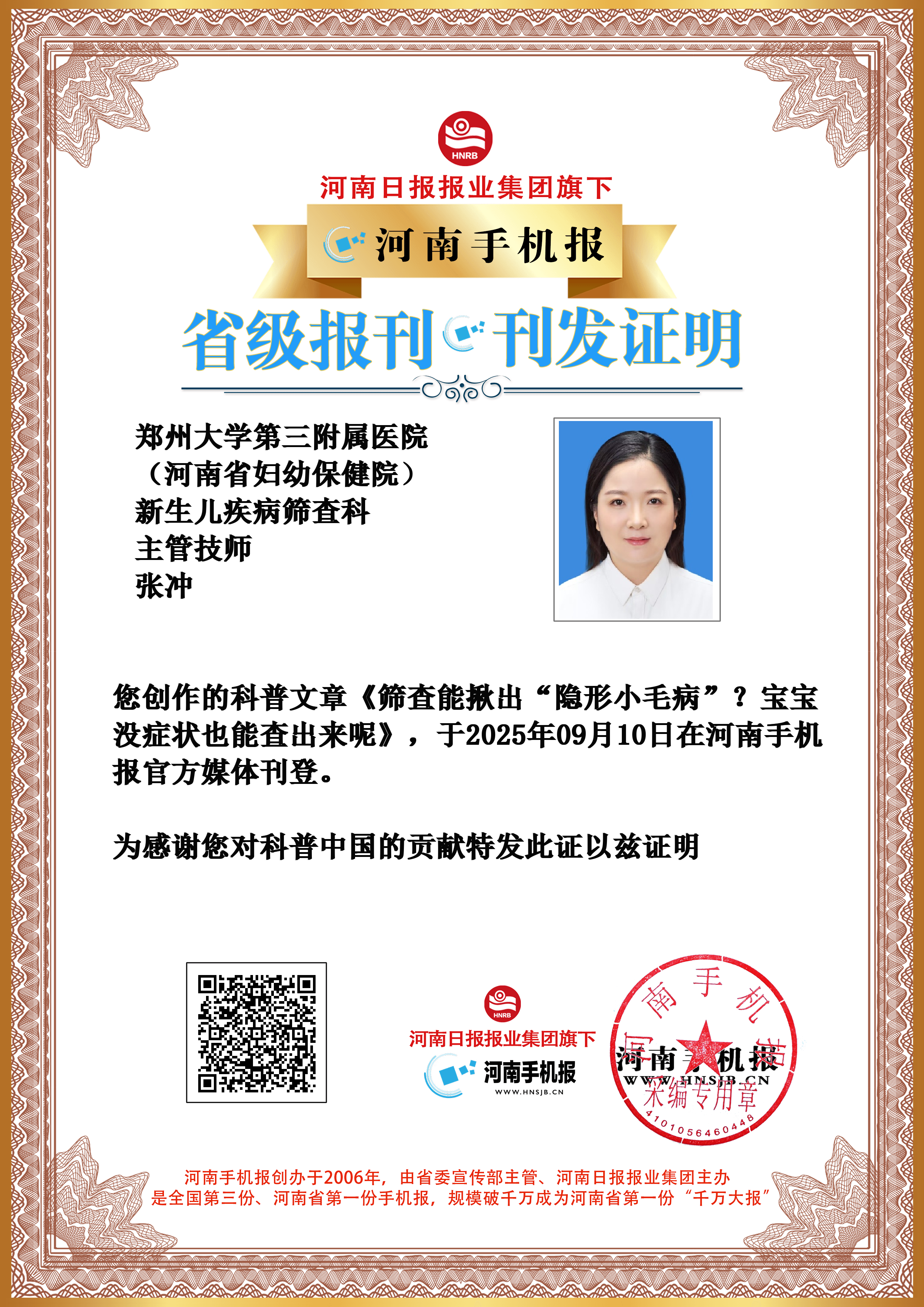 (张冲 郑州大学第三附属医院(河南省妇幼保健院) 新生儿疾病筛查科 主管技师)