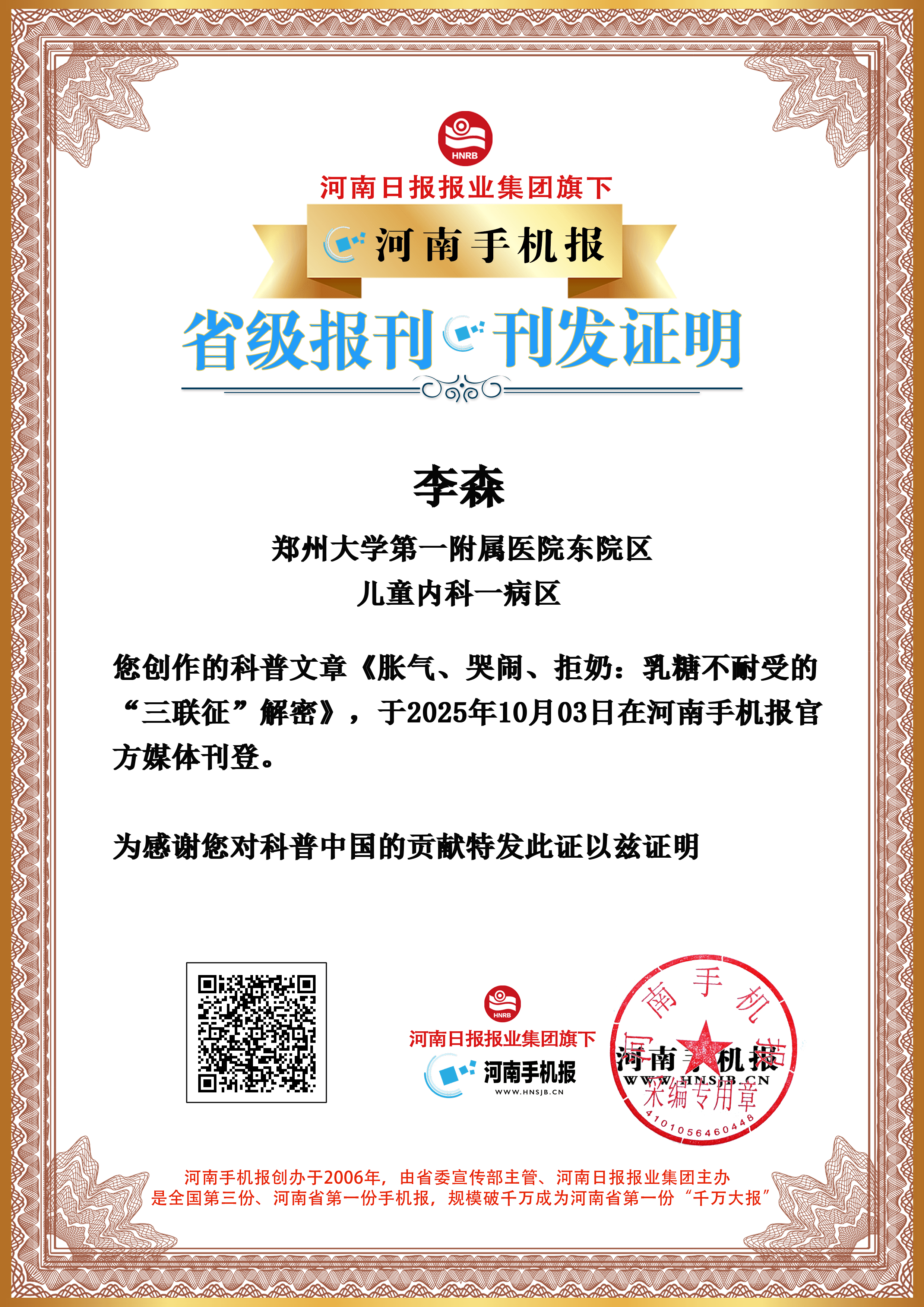 总之,乳糖不耐受引发的胀气、哭闹、拒奶"三联征",是婴幼儿期常见的消化问题,若未能及时识别和干预,可能影响宝宝的营养状况和生长发育。家长可通过"喂养后症状加重、停止乳制品后缓解"的特点进行初步判断,确诊后采取科学的干预措施:母乳喂养儿可采用母亲饮食调整+乳糖酶补充的方案,配方奶喂养儿可选择无乳糖配方,同时注意与牛奶蛋白过敏等疾病相鉴别。多数情况下,随着婴儿肠道发育成熟,乳糖酶分泌功能会逐渐完善,尤其是继发性乳糖不耐受患儿,经过数周至数月的规范管理后,通常可恢复正常饮食。当发现宝宝出现上述症状时,建议及时咨询儿科消化专科医生,通过专业评估制定个性化管理方案,让宝宝摆脱不适困扰,健康快乐成长。