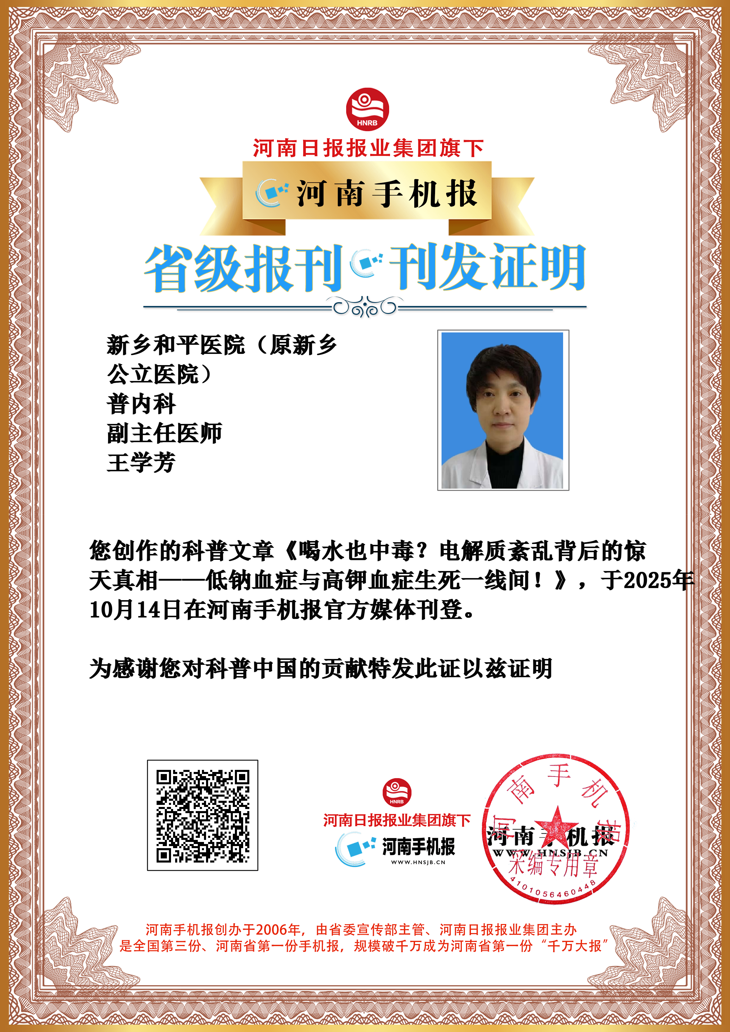 (王学芳 新乡和平医院(原新乡公立医院) 普内科 副主任医师)