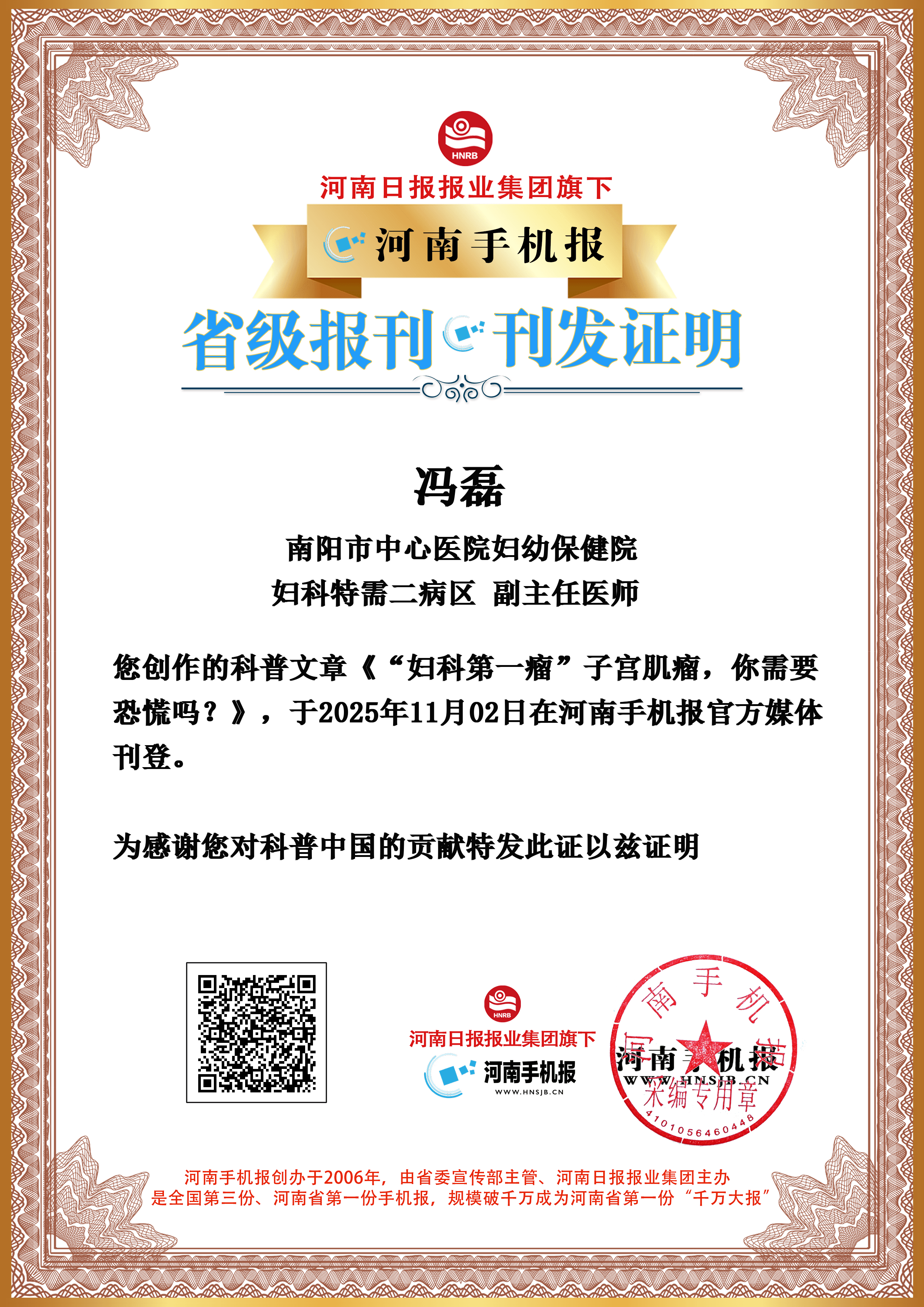 (冯磊 南阳市中心医院妇幼保健院 妇科特需二病区 副主任医师)