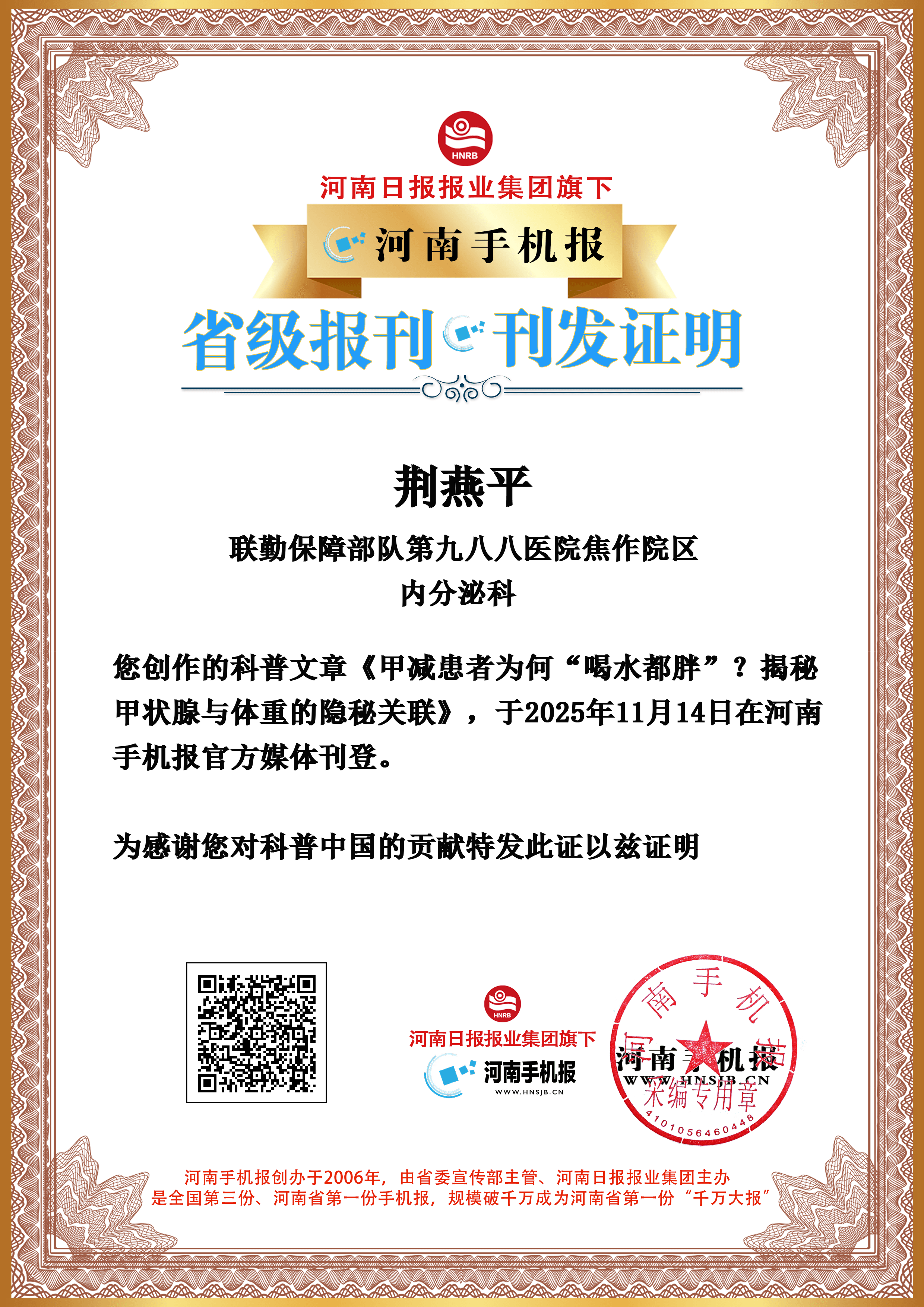 综上所述,甲减所致“喝水都胖”的现象,主要与低代谢状态及水钠潴留有关。通过规范的药物治疗、合理饮食与适度运动相结合的生活方式干预,大多数患者的体重问题及其他症状可得到有效改善。维持良好的医患沟通、遵医嘱服药并坚持定期随访,是甲减患者实现长期病情稳定、提升生活质量的重要措施。