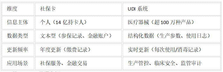社保卡虽集成社保、金融、医疗等功能,但其信息维度侧重于个人权益记录,而UDI系统则聚焦于产品全生命周期管理。二者差异体现在: