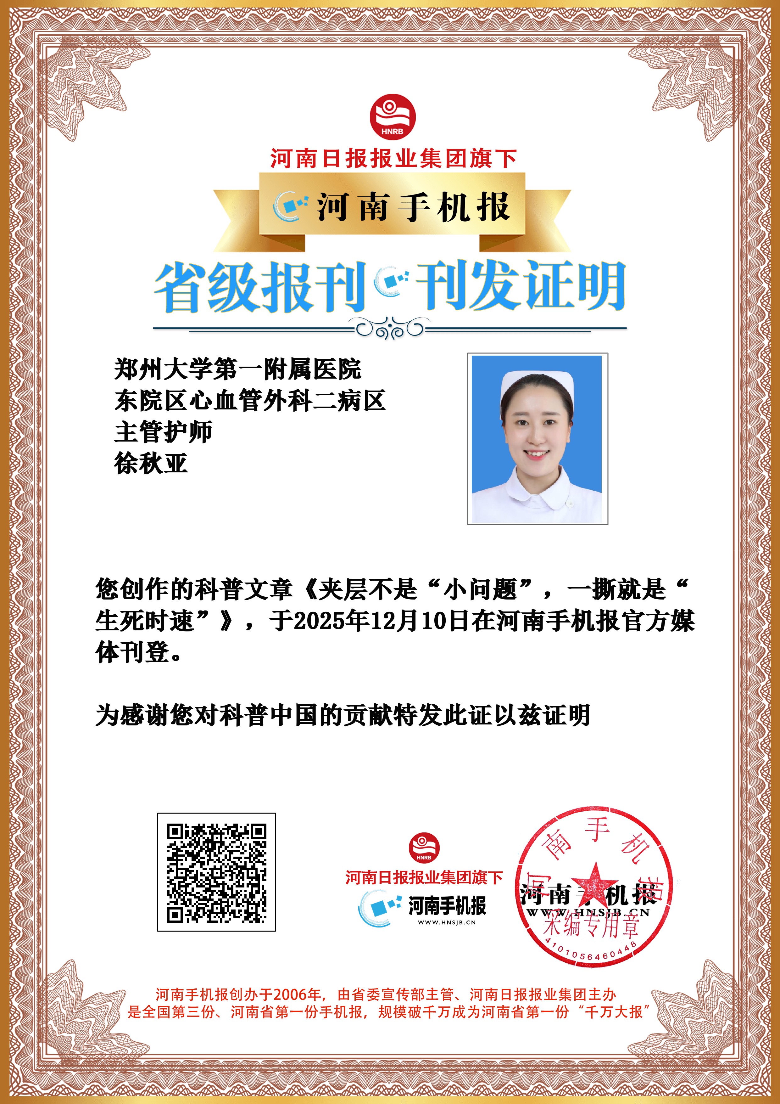 (徐秋亚 郑州大学第一附属医院 东院区心血管外科二病区 主管护师)