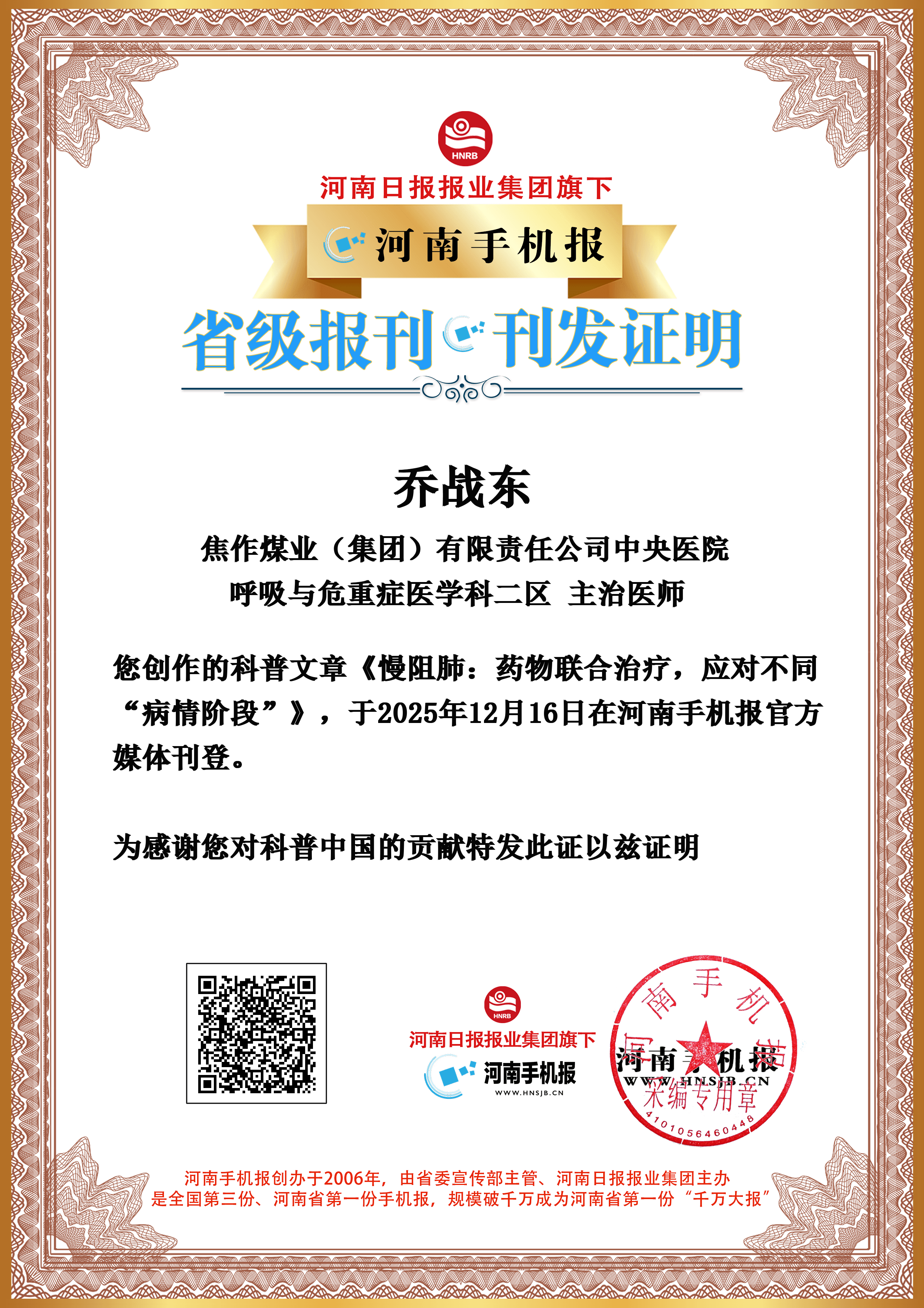 (乔战东 焦作煤业(集团)有限责任公司中央医院 呼吸与危重症医学科二区 主治医师)