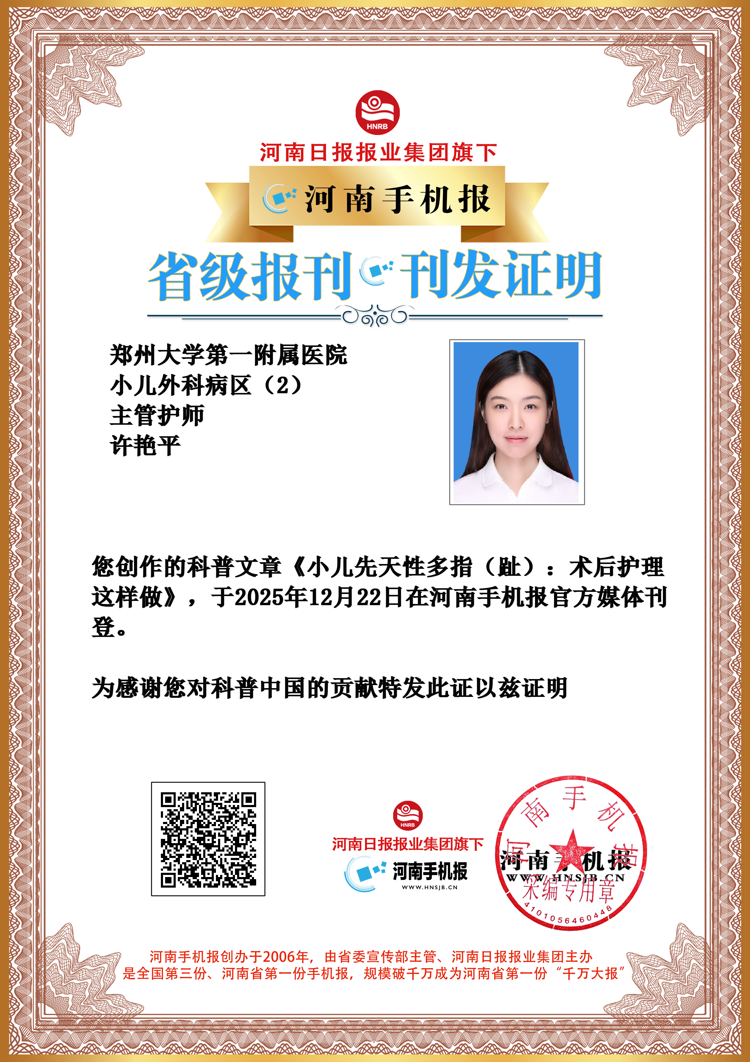(许艳平 郑州大学第一附属医院 小儿外科病区(2) 主管护师)