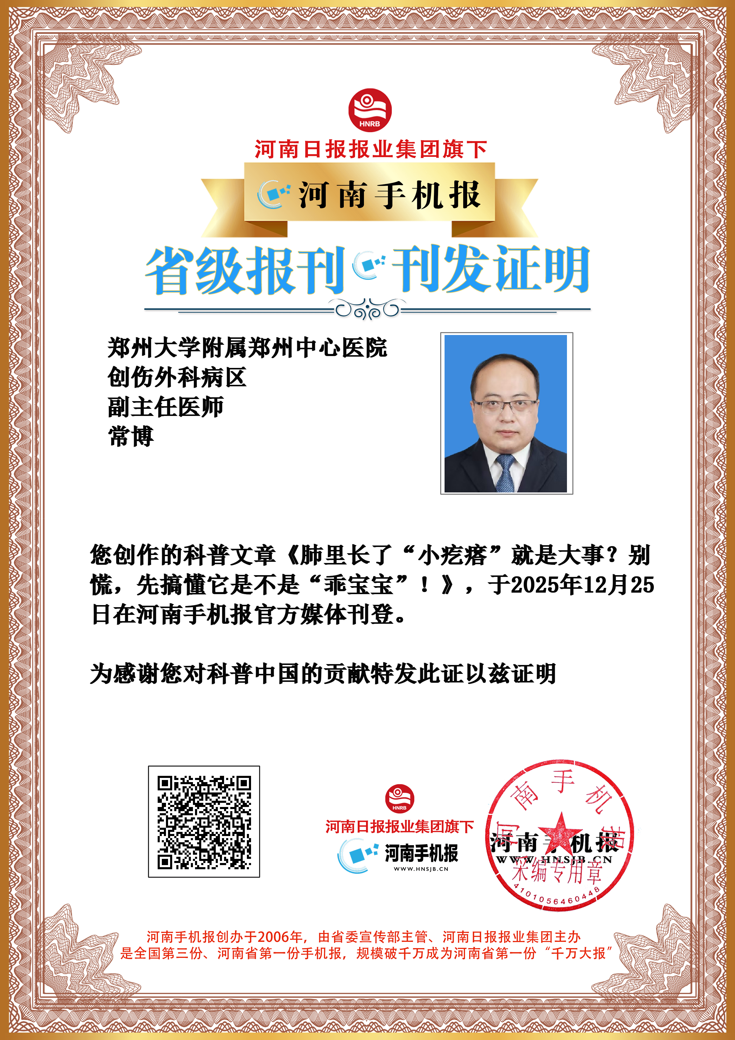 (常博 郑州大学附属郑州中心医院 创伤外科病区 副主任医师)