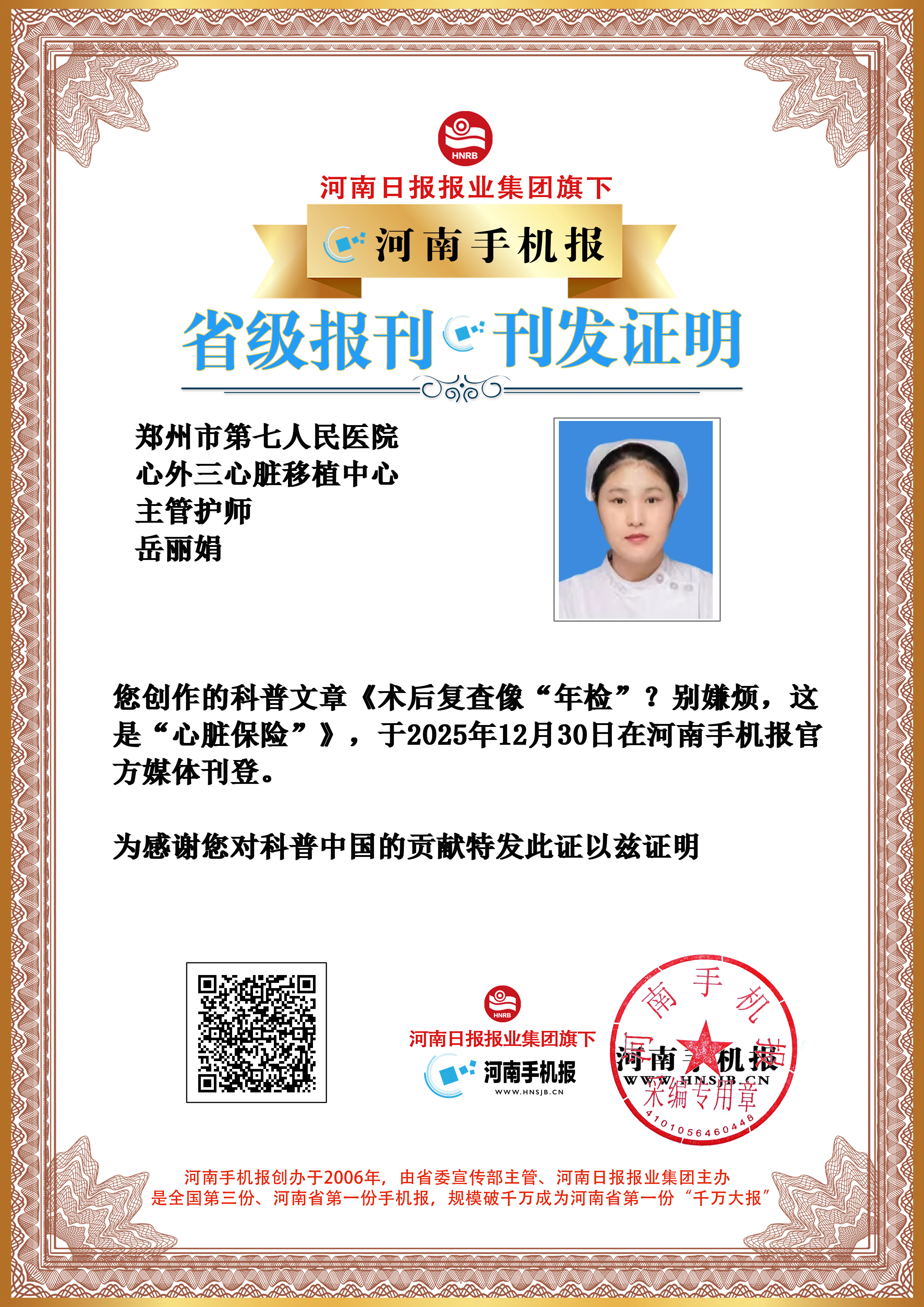 (岳丽娟 郑州市第七人民医院 心外三心脏移植中心 主管护师)