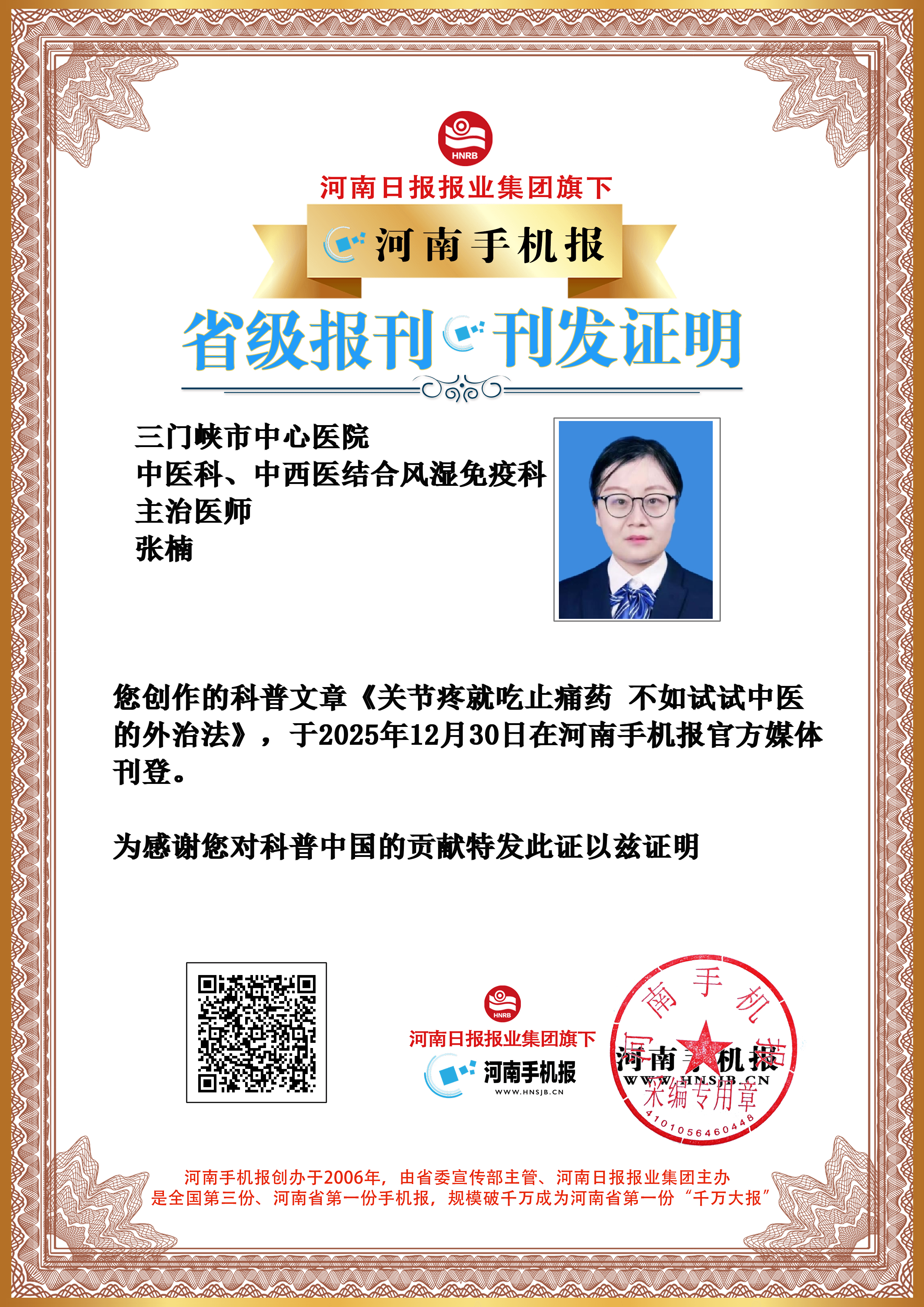 (张楠 三门峡市中心医院 中医科、中西医结合风湿免疫科 主治医师)
