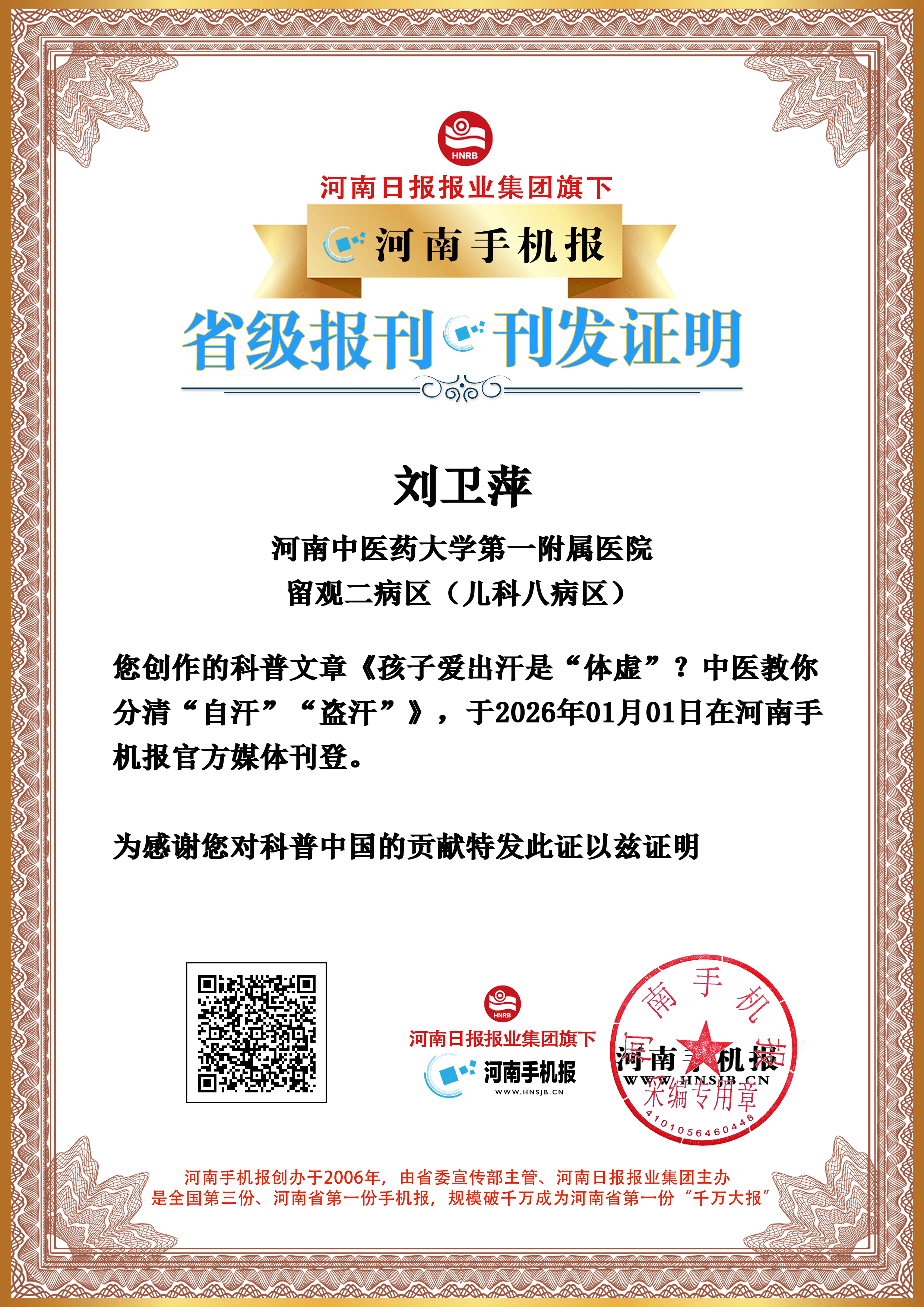(刘卫萍 河南中医药大学第一附属医院 留观二病区(儿科八病区))