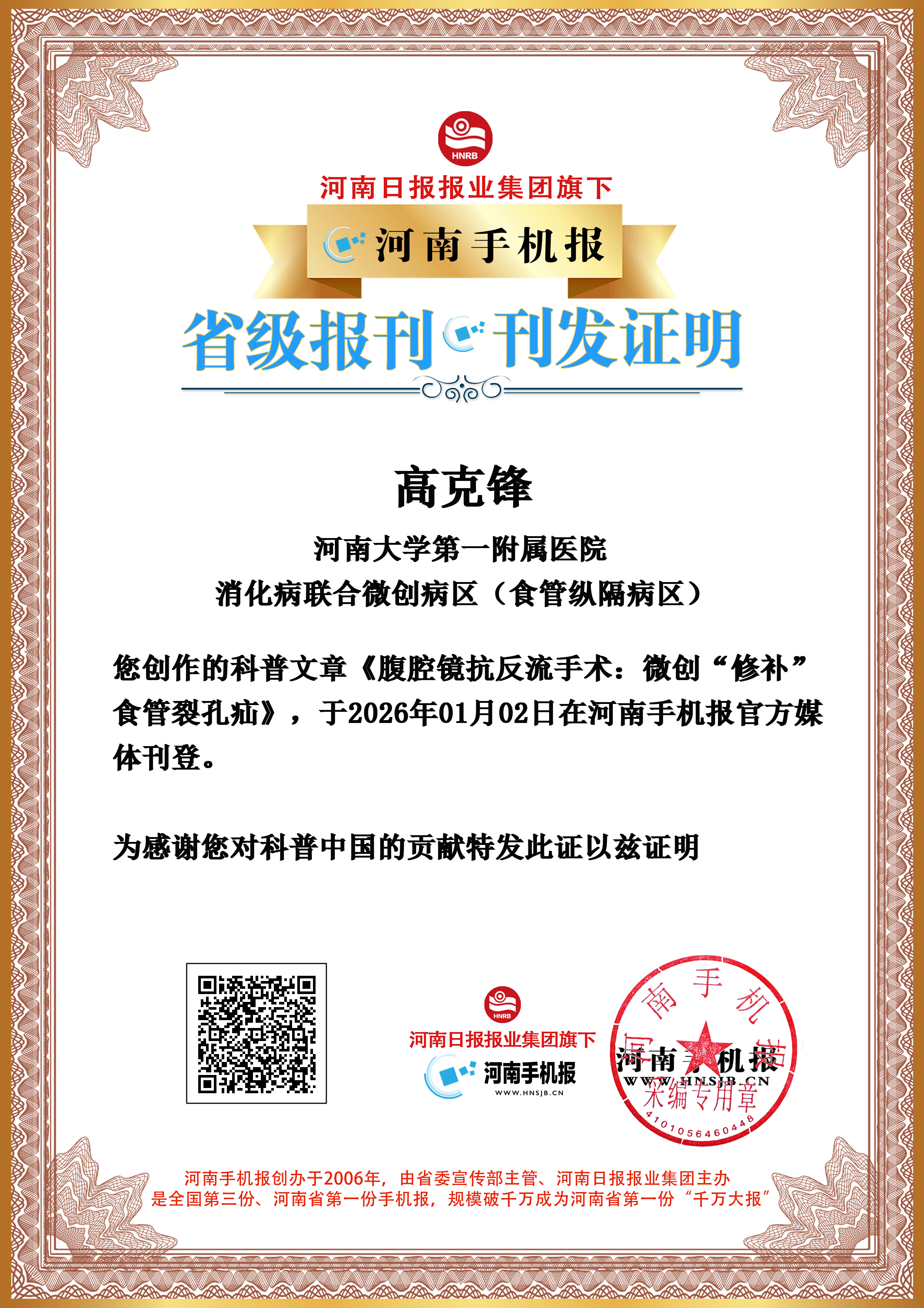 (高克锋 河南大学第一附属医院 消化病联合微创病区(食管纵隔病区))