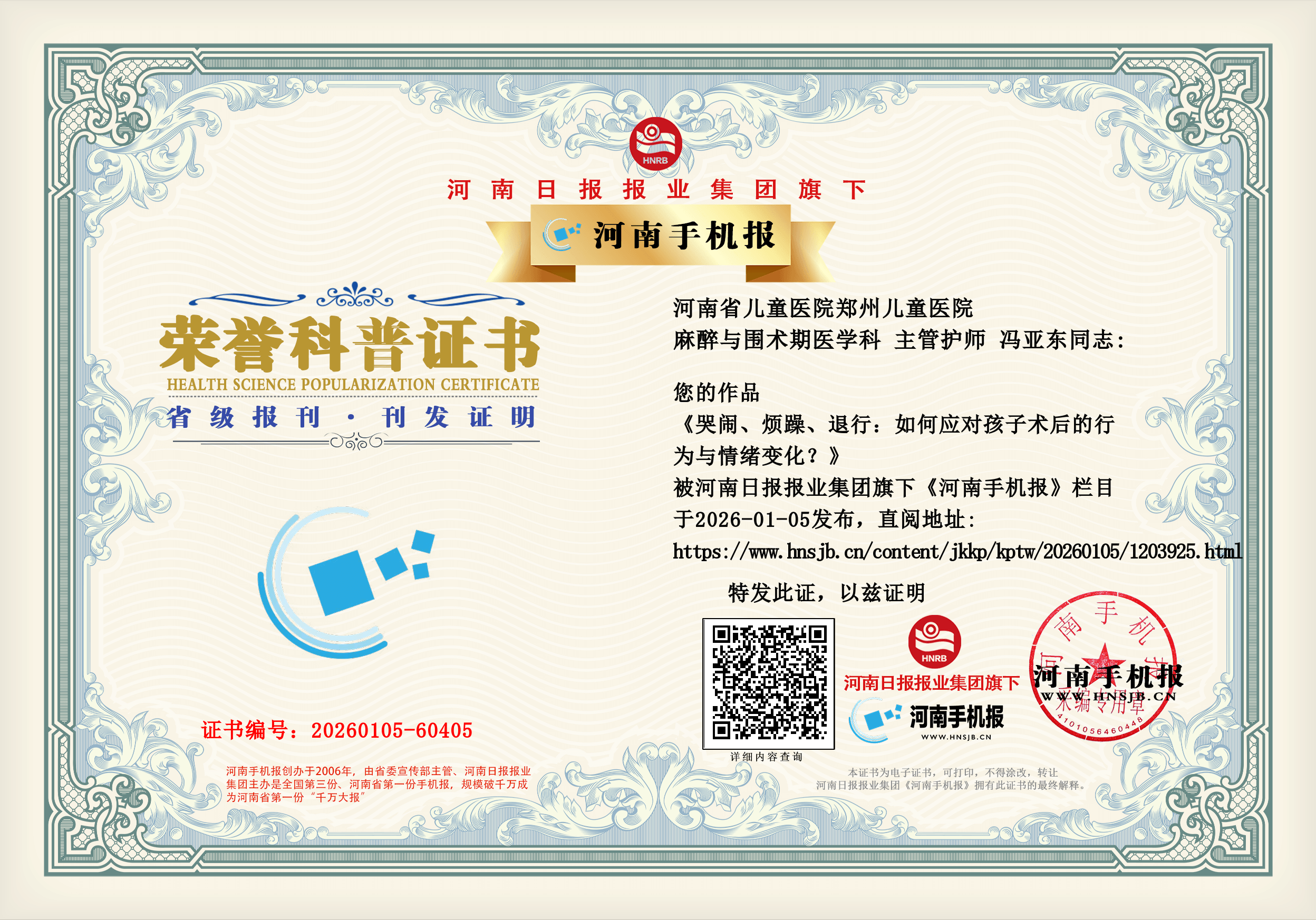 (冯亚东 河南省儿童医院郑州儿童医院 麻醉与围术期医学科 主管护师)