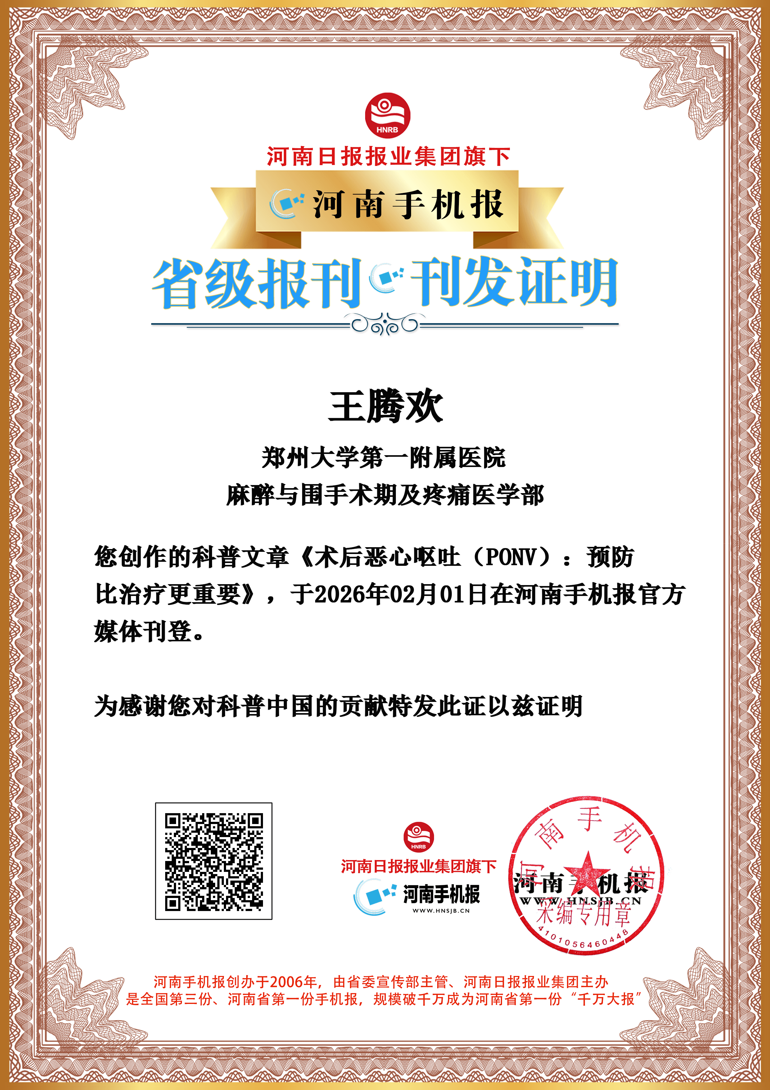 (王腾欢 郑州大学第一附属医院 麻醉与围手术期及疼痛医学部)