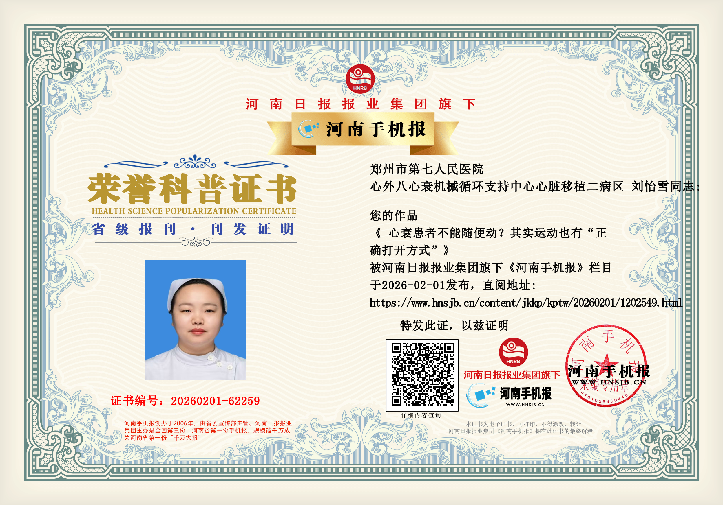 (刘怡雪 郑州市第七人民医院 心外八心衰机械循环支持中心心脏移植二病区 主管护师)