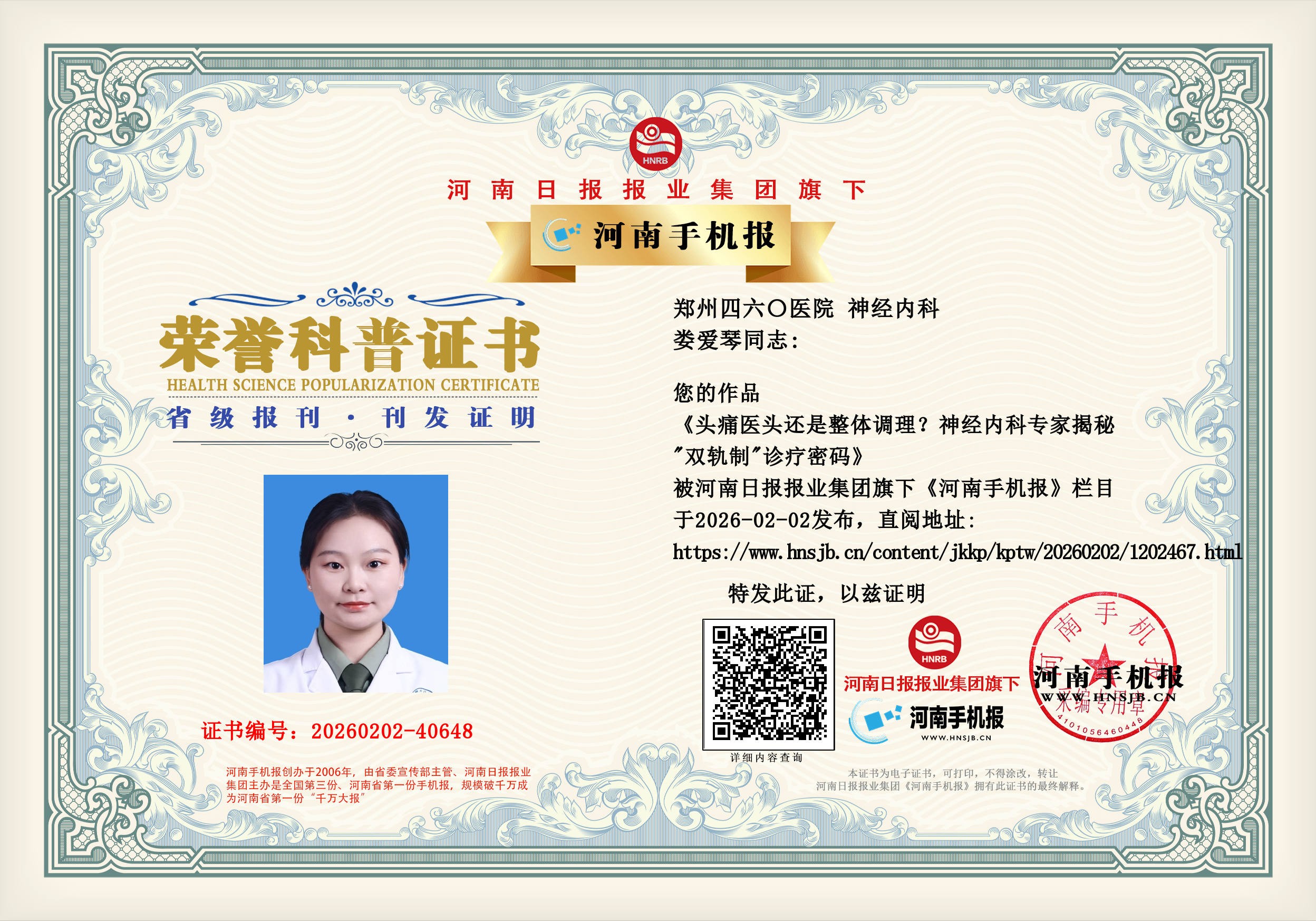 娄爱琴:头痛医头还是整体调理?神经内科专家揭秘"双轨制"诊疗密码
