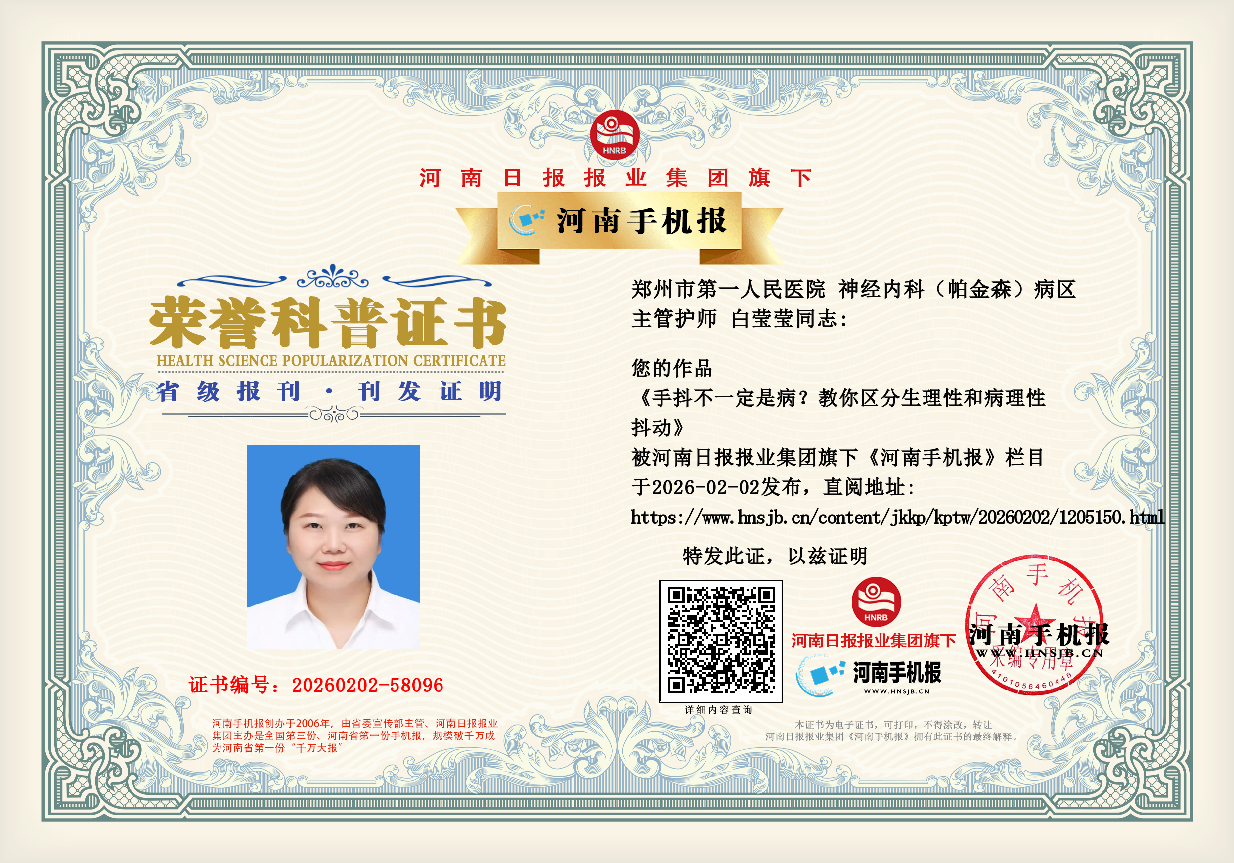 (白莹莹 郑州市第一人民医院 神经内科(帕金森)病区 主管护师)
