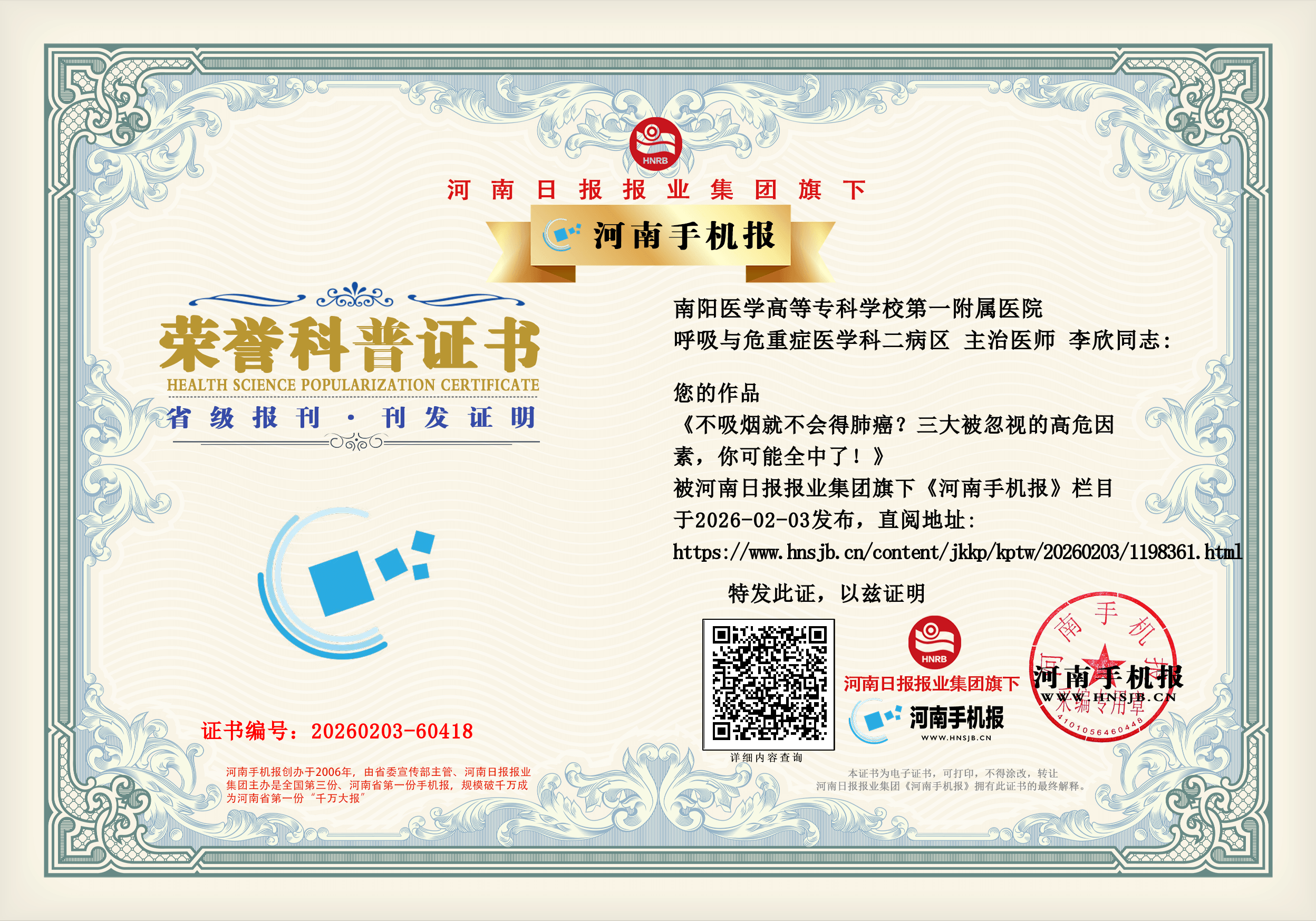 (李欣 南阳医学高等专科学校第一附属医院 呼吸与危重症医学科二病区 主治医师)