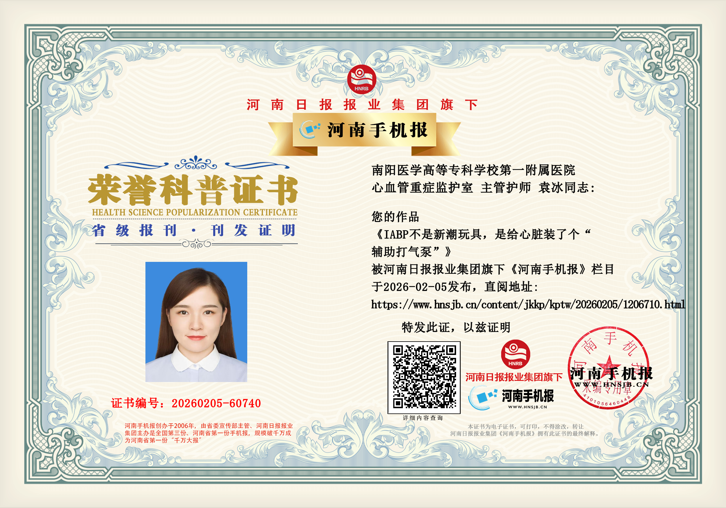 (袁冰 南阳医学高等专科学校第一附属医院 心血管重症监护室 主管护师)