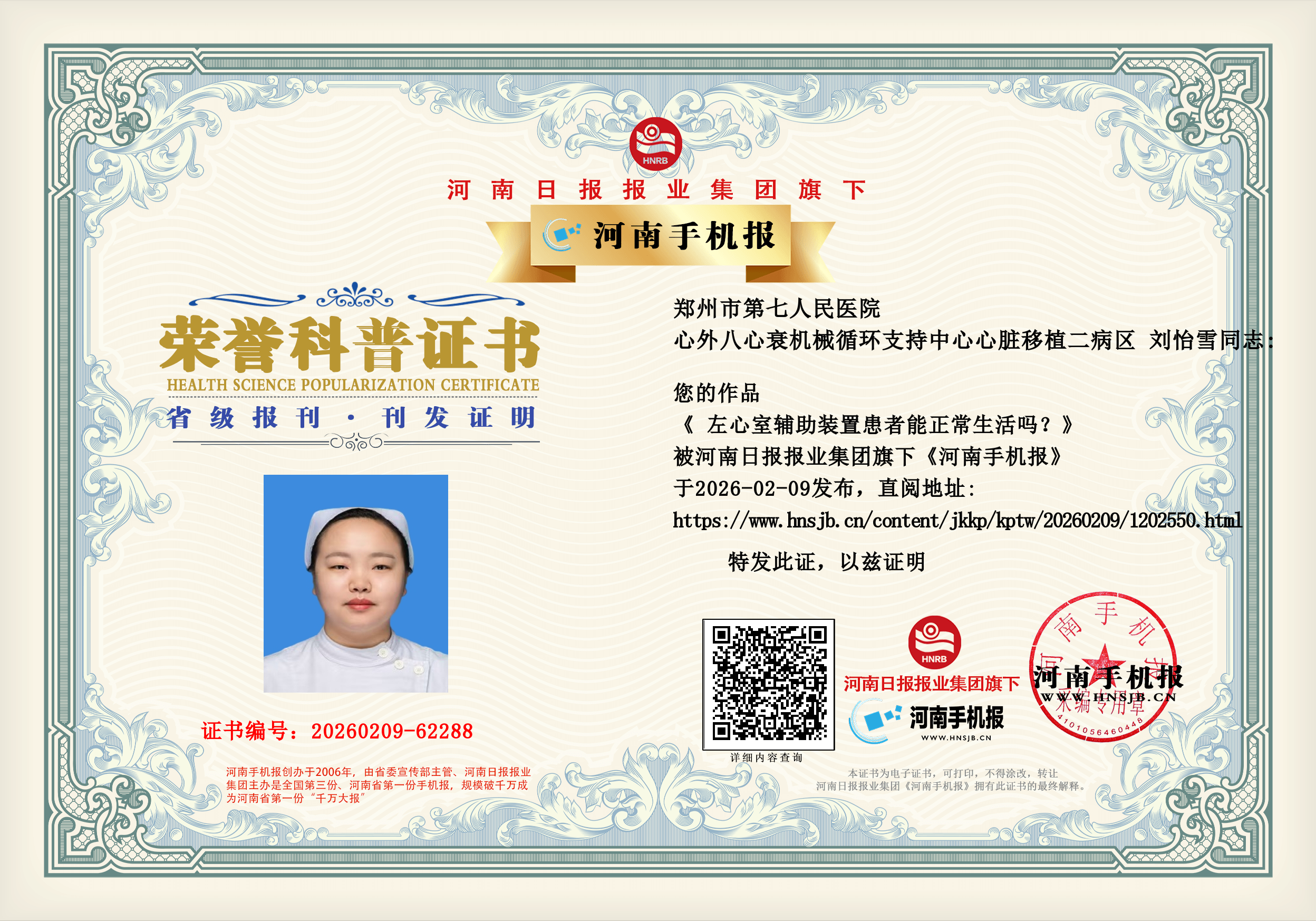 (刘怡雪 郑州市第七人民医院 心外八心衰机械循环支持中心心脏移植二病区 主管护师)