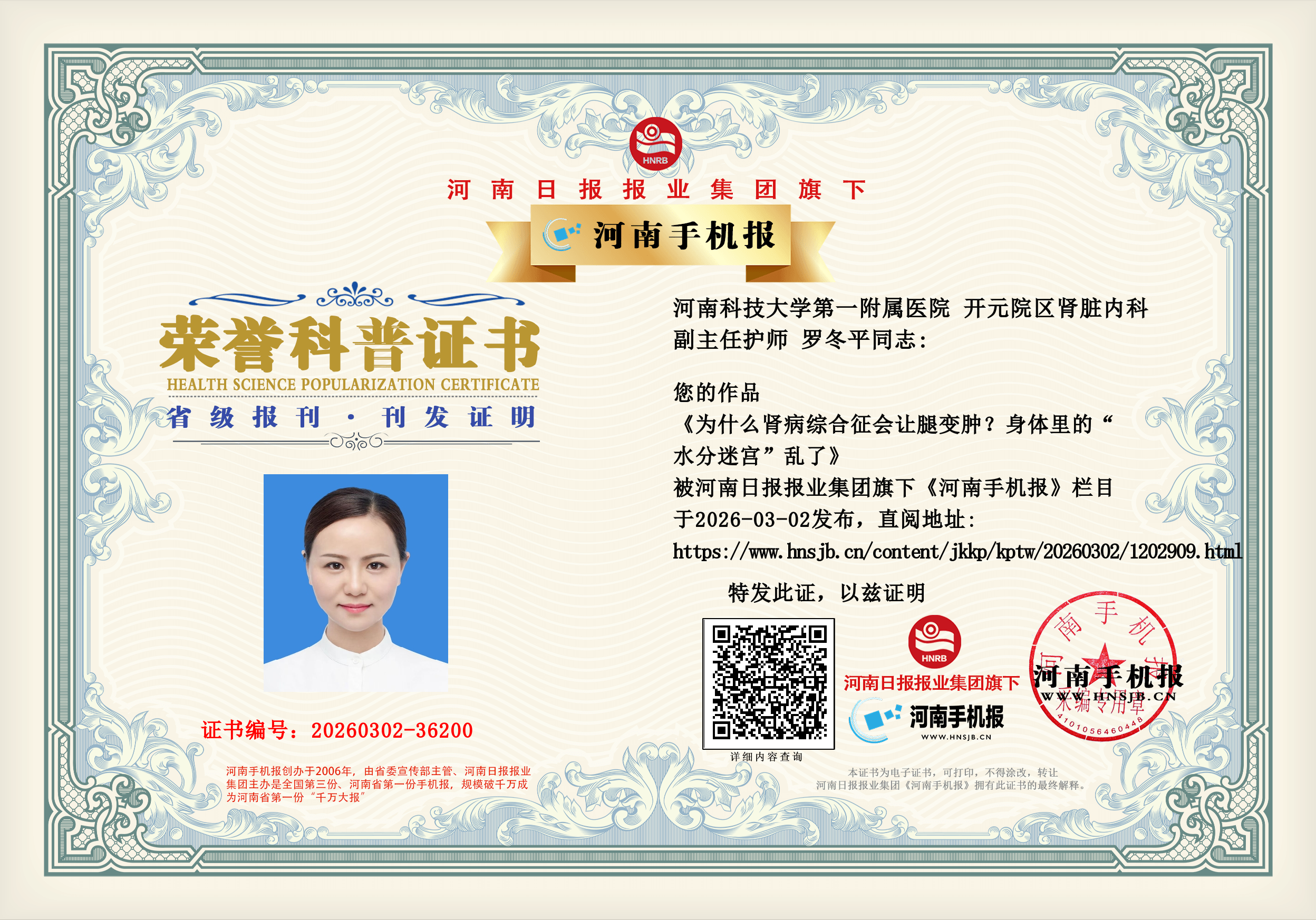 (罗冬平 河南科技大学第一附属医院 开元院区肾脏内科 副主任护师)