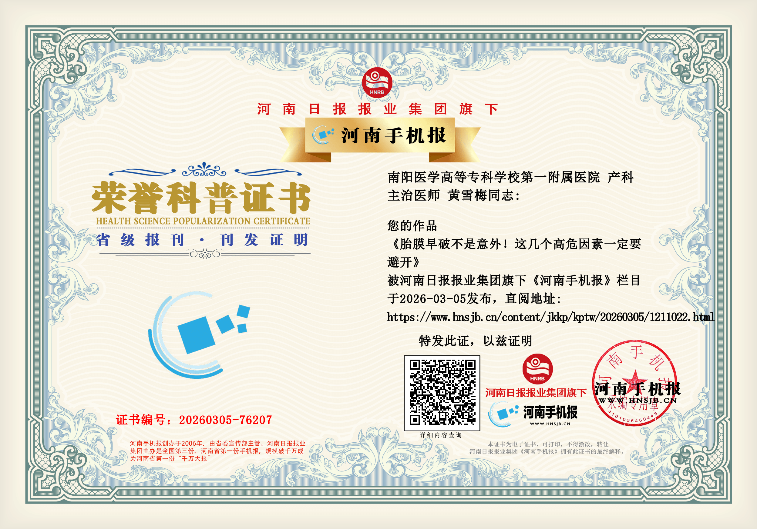 (黄雪梅 南阳医学高等专科学校第一附属医院 产科 主治医师)