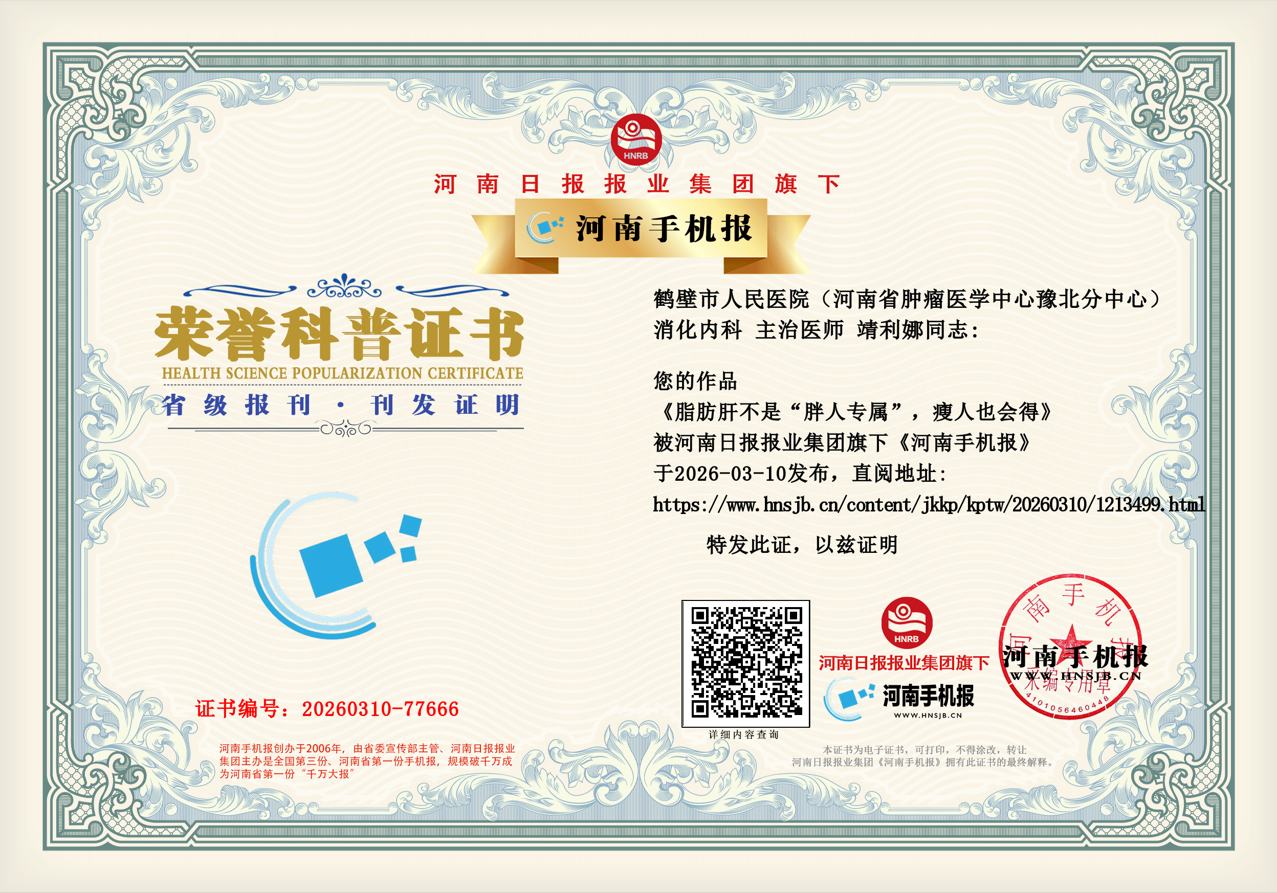 (靖利娜 鹤壁市人民医院(河南省肿瘤医学中心豫北分中心) 消化内科 主治医师)