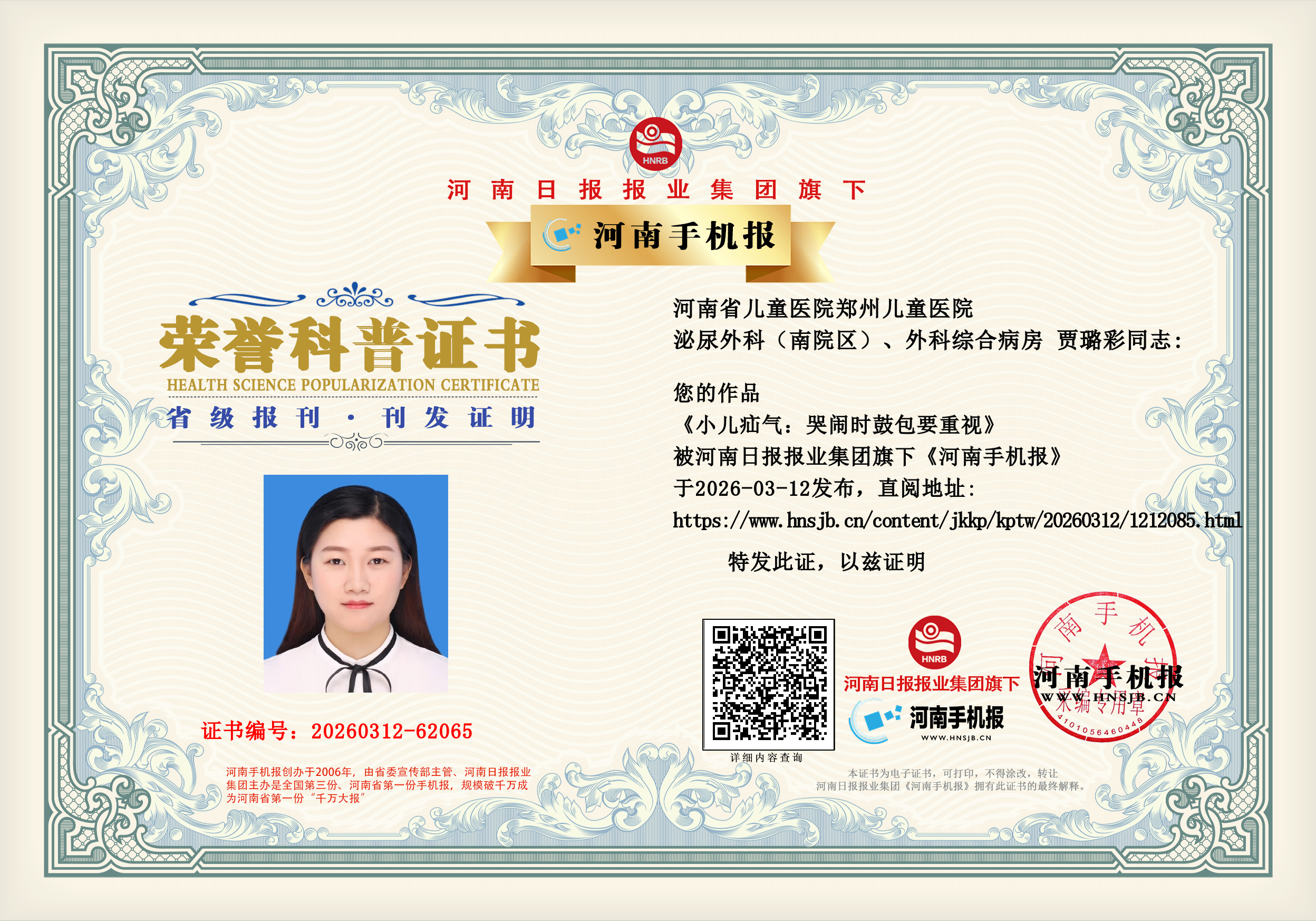 (贾璐彩 河南省儿童医院郑州儿童医院 泌尿外科(南院区)、外科综合病房 副主任护师)