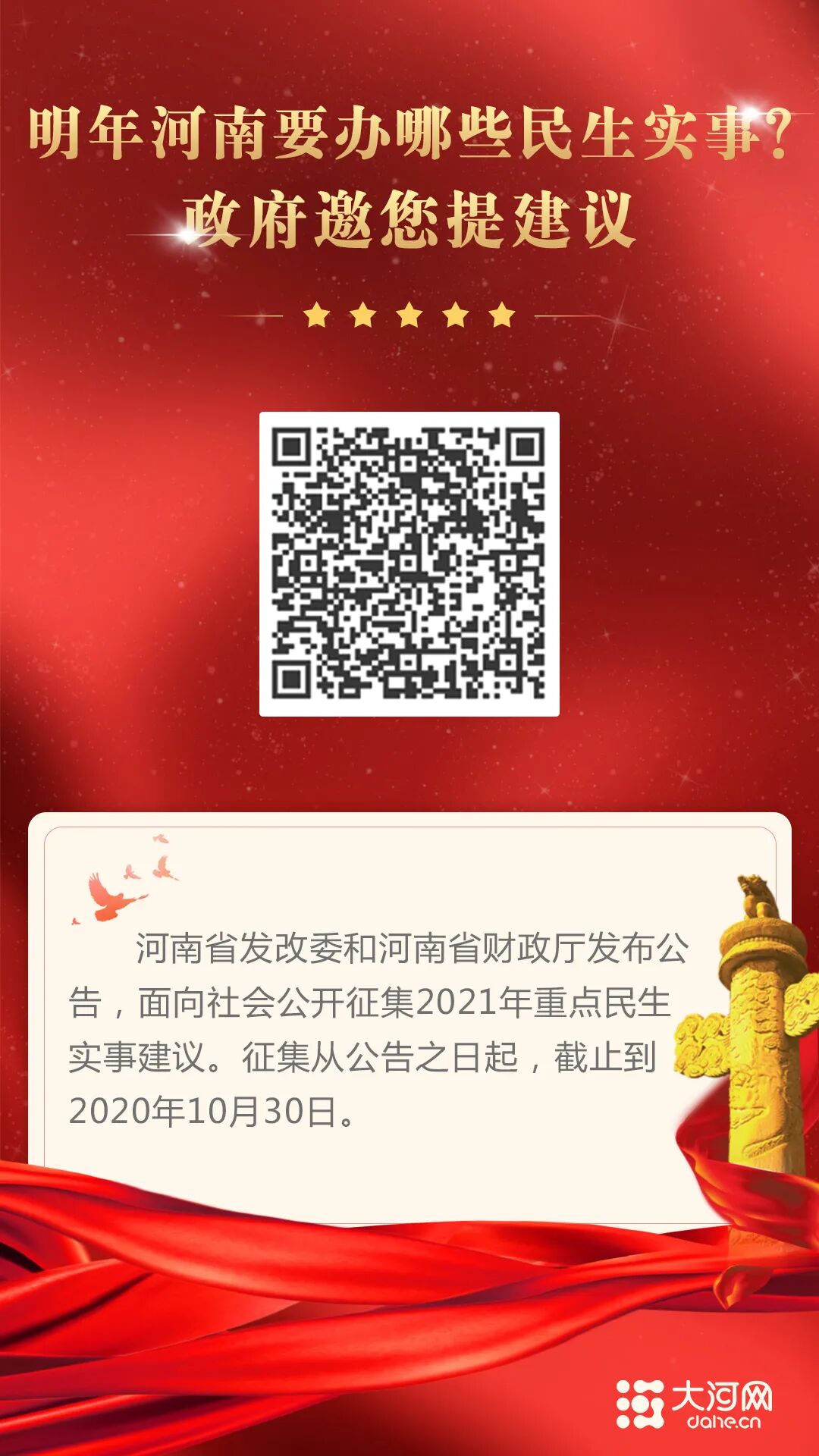 为拟定好2021年民生实事,提高政府工作的透明度和群众的参与度,确保各项实事更加符合民意、更加富有成效,河南决定在全省范围内开展向人民群众和社会各界征集2021年民生实事建议活动,本次征集由省发展改革委、省财政厅具体负责,征集从公告之日起,截止到2020年10月30日。