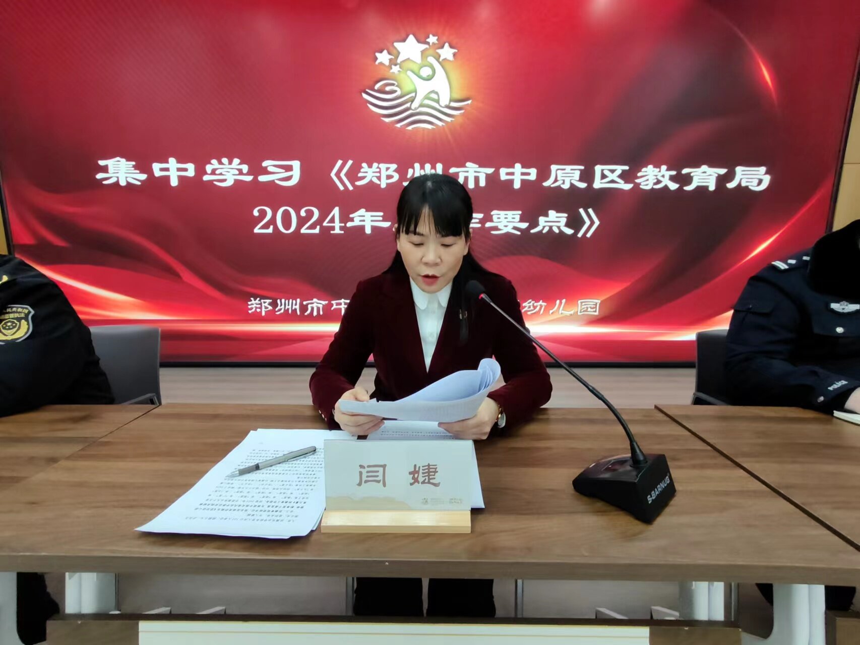 2月25日下午,郑州市中原区滨河花园幼儿园召开2024年工作务虚会暨新学期开学工作会,贯彻落实2024年中原区教育工作会议精神,集中学习《郑州市中原区教育局2024年工作要点》,全面总结2023年工作,集思广益谋划2024年重点工作,统筹安排部署新学期开学工作。按照滨河幼家校社协同育人联动机制要求,郑州市公安局中原分局柳湖派出所副所长邢向、郑州市中原区市场监督管理局柳湖所副所长孙科、永威置业滨河花园项目秩序部消防负责人刘鹏辉、幼儿园家委会代表张慧出席会议并发言,幼儿园全体教职工参加会议。幼儿园党支部书记、园长闫婕主持会议。