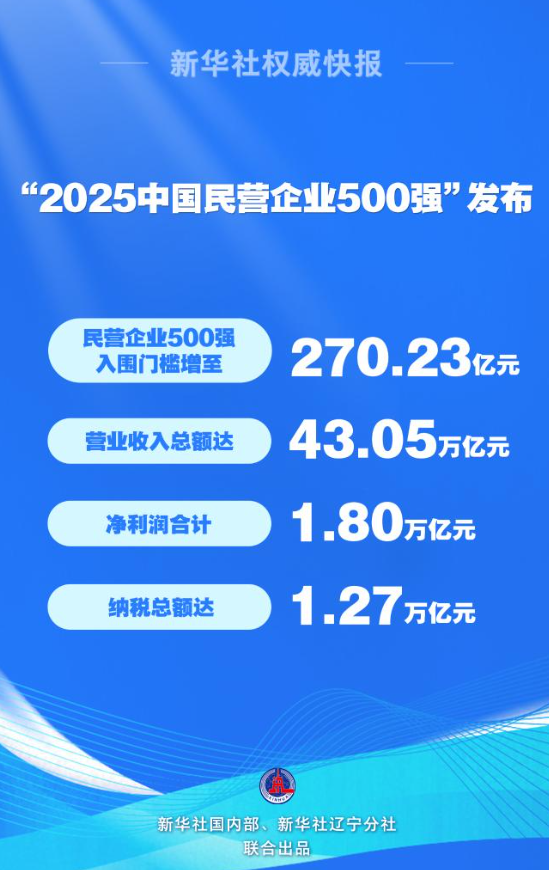 ●8月28日,全国工商联发布“2025中国民营企业500强”。京东集团、阿里巴巴(中国)有限公司、恒力集团有限公司位居前三。15家河南企业上榜,包括洛阳栾川钼业集团、牧原实业集团、伊电控股集团有限公司、河南双汇投资发展股份有限公司、河南金利金铅集团有限公司、郑州中瑞实业集团有限公司、济源市万洋冶炼(集团)有限公司、河南豫联能源集团有限责任公司、郑州宇通企业集团、河南龙成集团有限公司、河南明泰铝业股份有限公司、河南济源钢铁(集团)有限公司、卫华集团有限公司、河南正商企业发展集团有限责任公司、龙佰集团股份有限公司。(大河财立方)