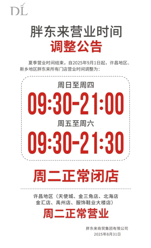 胖东来夏季营业时间结束,9月1日起,许昌地区、新乡地区胖东来所有门店将调整营业时间:周日至周四,9:30~21:00;周五至周六,营业时间延长半小时,为9:30~21:30,周二正常闭店。此次调整后,许昌地区(天使城、金三角店、北海店、金汇店、禹州店、服饰鞋业大楼店)周二正常营业。