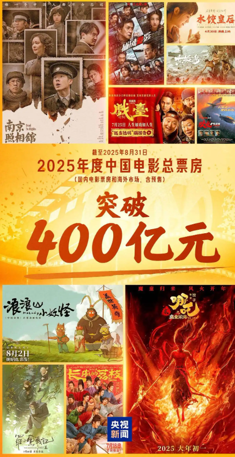 据网络平台数据,截至8月31日13时53分,2025年度中国电影总票房(含海外)突破400亿元,其中,国内市场总票房392.3亿元观影人次超9.09亿,均超去年同期。今年以来,在《哪吒之魔童闹海》《南京照相馆》等影片带动下,中国电影海外市场票房折合人民币已超7.7亿元,创下多年新高。
