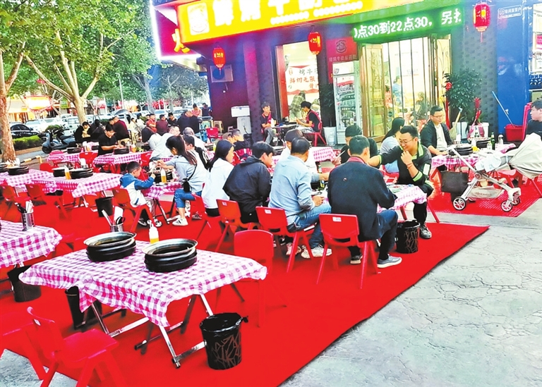 店外经营俗称“店外摆”“店外卖”,餐饮店在符合条件并提交需求后,县城市管理局“即申请、即受理”。目前,城区已有47家餐饮店获准店外经营,统一经营时间为18:00至23:00。管理要求做到“一桌一毯一桶”,即每个餐桌下铺设防油毡毯,桌旁配上垃圾桶,力求实现“有烟火无油烟,有人气不堵路,亲民不扰民”。