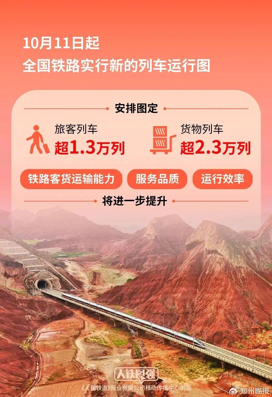 10月11日起,全国铁路实行新的列车运行图,保持客货列车开行规模,优化列车开行结构,安排图定旅客列车超1.3万列,货物列车超2.3万列,铁路客货运输能力、服务品质和运行效率将进一步提升。