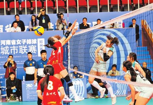10月10日19点30分,2025年河南省女子排球城市联赛第二阶段的比赛在郑州、商丘、周口、开封四地同时开赛。在郑州体育馆,主场作战的郑州队3比0胜洛阳队,赢得这场强强对话。当天其他几场比赛的结果分别是,商丘科迪花木兰队0比3不敌新乡南太行队,周口队0比3不敌航空港区队,开封龙亭队3比0胜平顶山队。图为:郑州队与洛阳队比赛。