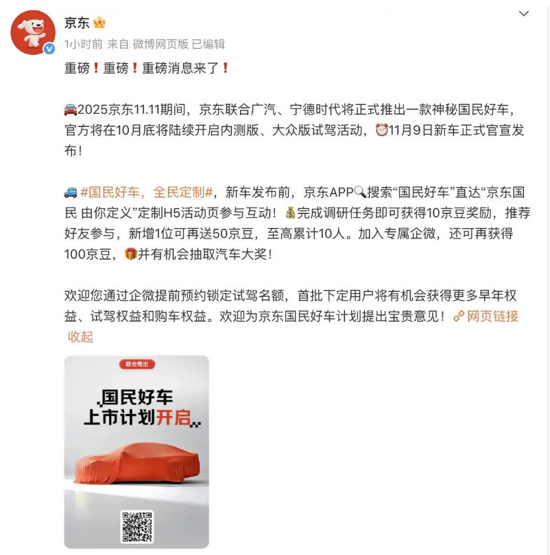 10月14日,京东微博宣布将联合广汽、宁德时代推出一款汽车,官方将在10月底陆续开启内测版、大众版试驾活动,11月9日新车正式发布。不少媒体据此解读为“京东进军汽车行业,下场造车并推出京东品牌的汽车”。对此,京东方面称,该款新车是三方联合推出,京东主要提供用户消费洞察和独家销售,不直接涉及制造环节。