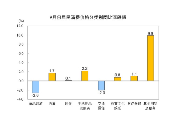 9月份,全国居民消费价格环比上涨0.1%。其中,城市持平,农村上涨0.2%;食品价格上涨0.7%,非食品价格下降0.1%;消费品价格上涨0.3%,服务价格下降0.3%。