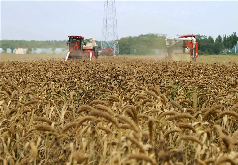 10月19日,农机手驾驶收割机在南阳市卧龙区陆营镇收割晚谷子。 高嵩 摄
