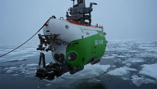 27日,依托我国自主设计建造的国际首艘具破冰能力的载人深潜作业母船“探索三号”及“奋斗者”号载人潜水器,执行北极载人深潜任务的科考队顺利返回。图为“奋斗者”号在北极密集冰区被起吊出水。