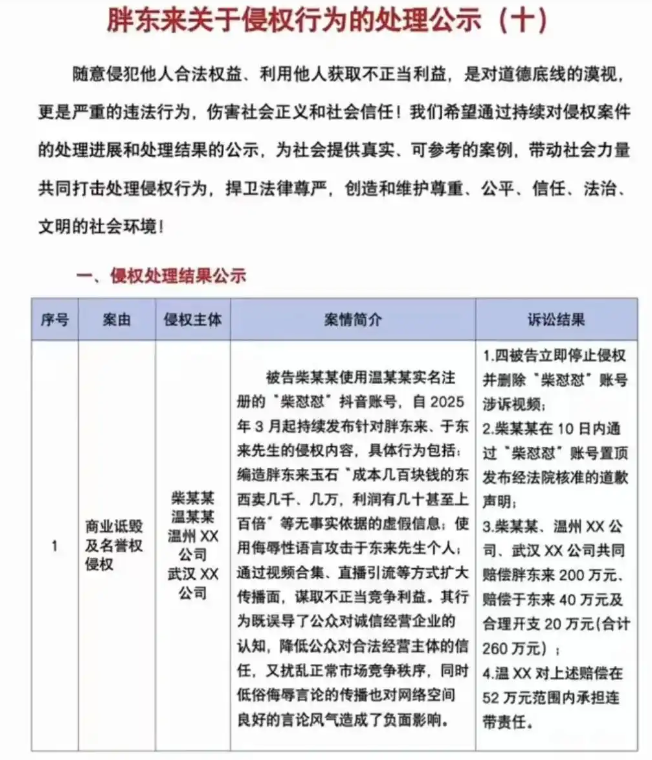 11月11日,胖东来发布关于侵权行为的处理公示,公布了柴怼怼案的诉讼结果。胖东来抖音官方账号发布的图片显示,柴某某,温州XX公司、武汉XX公司共同赔偿胖东来200万元,赔偿于东来40万元及合理开支20万元(合计260万元)。此外,温XX对上述赔偿在52万元范围内承担连带责任。