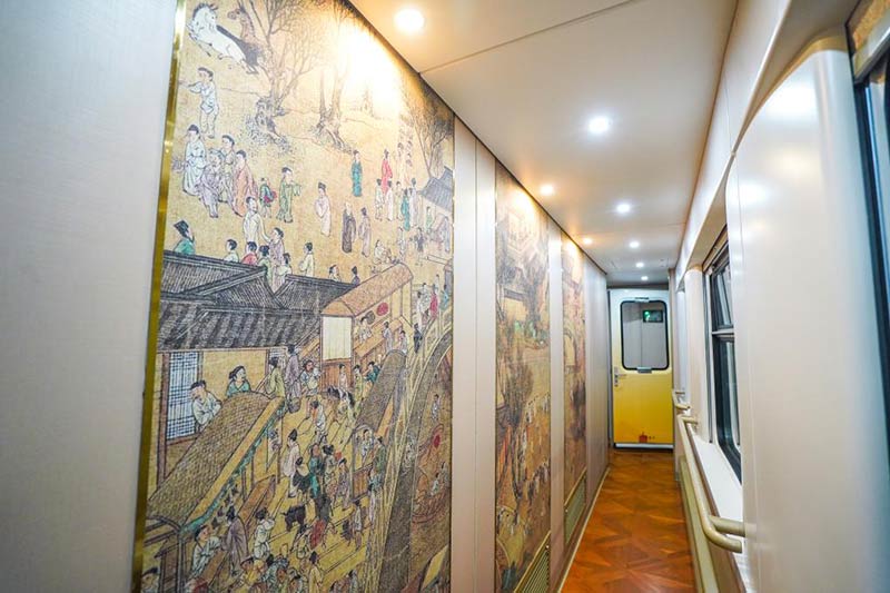 11月12日,Y752次列车从郑州站缓缓驶出,标志着“中原铁道·大河之南号”特色旅游列车赏菊新线开通。此次赏菊新线运行区段为郑州至开封,采用早出晚归的一日游运行模式,早上8点左右出发,17点左右返程,行程包含龙亭、古城墙、天波杨府、翰园碑林等开封标志性景点。图为以清明上河图为主题的特色车厢。